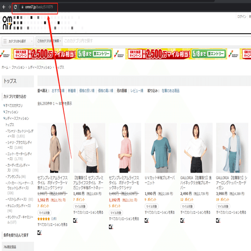 今回はレディースのトップの検索結果一覧ページを例として、スクレイピング方法を紹介します。まず、URLをコピーしてください。