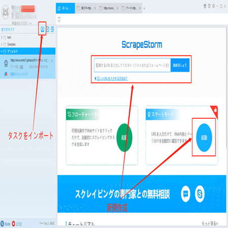 ScrapeStormのホムページ画面にスマートモードタスクを新規作成します。また、持っているタスクをインポートすることもできます。