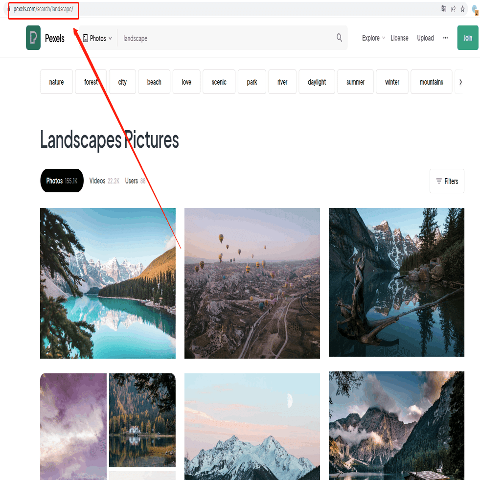 今回は風景をキーワードとして、その検索結果一覧ページを例として、スクレイピング方法を紹介します。まず、URLをコピーしてください。
