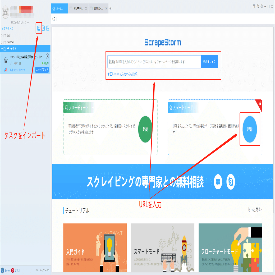 ScrapeStormのホムページ画面にスマートモードタスクを新規作成します。また、持っているタスクをインポートすることもできます。
