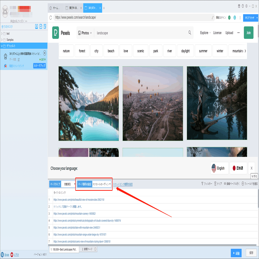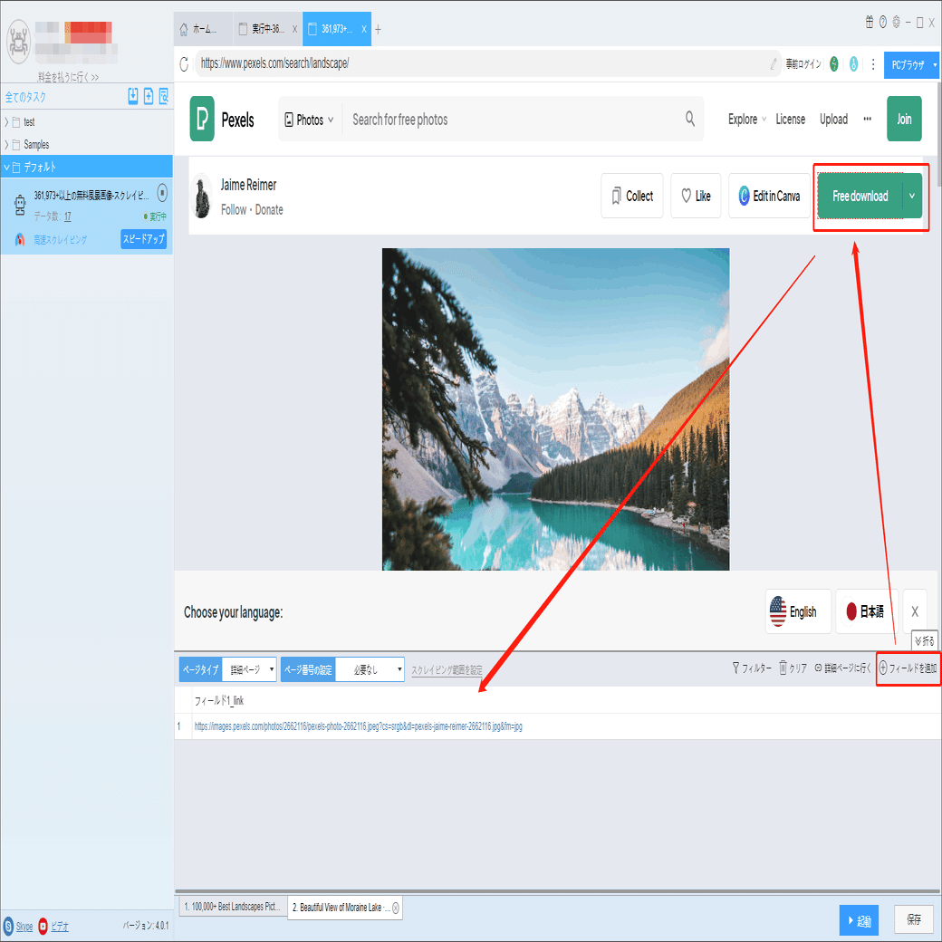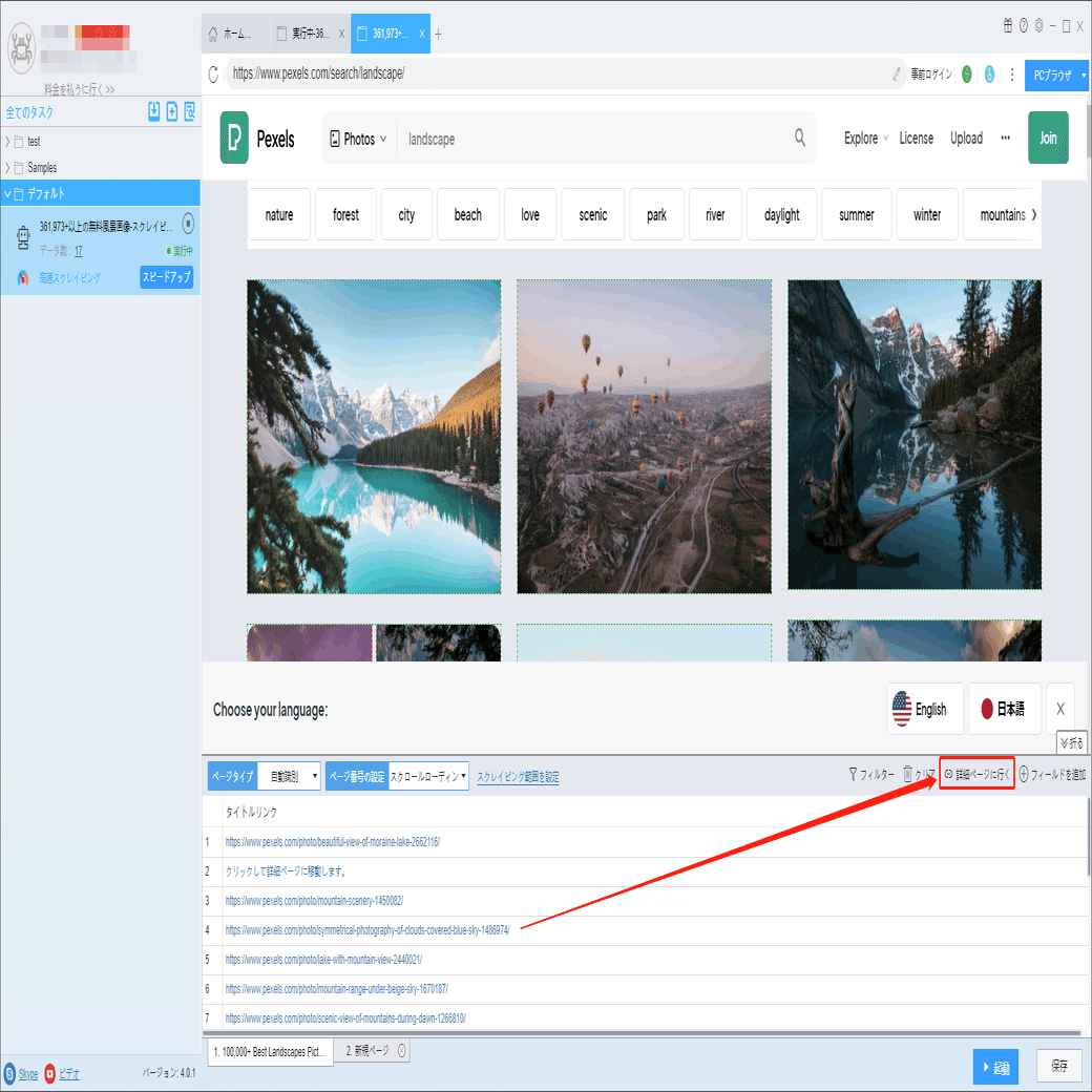 画像の作者などの詳細情報は詳細ページに付いていますから、ソフトウェアの「詳細ページに行く」機能を利用して、データを抽出します。