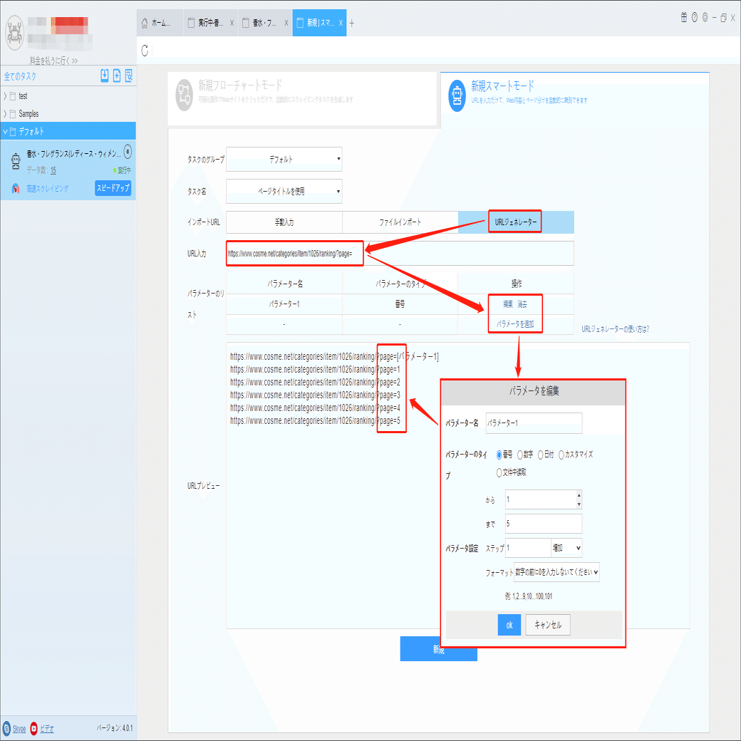 URLジェネレーターでURLを入力して、パラメーターを追加画面にページ数を入力します。今回は5までです。生成したURLはプレビュー画面でチェックしてください。