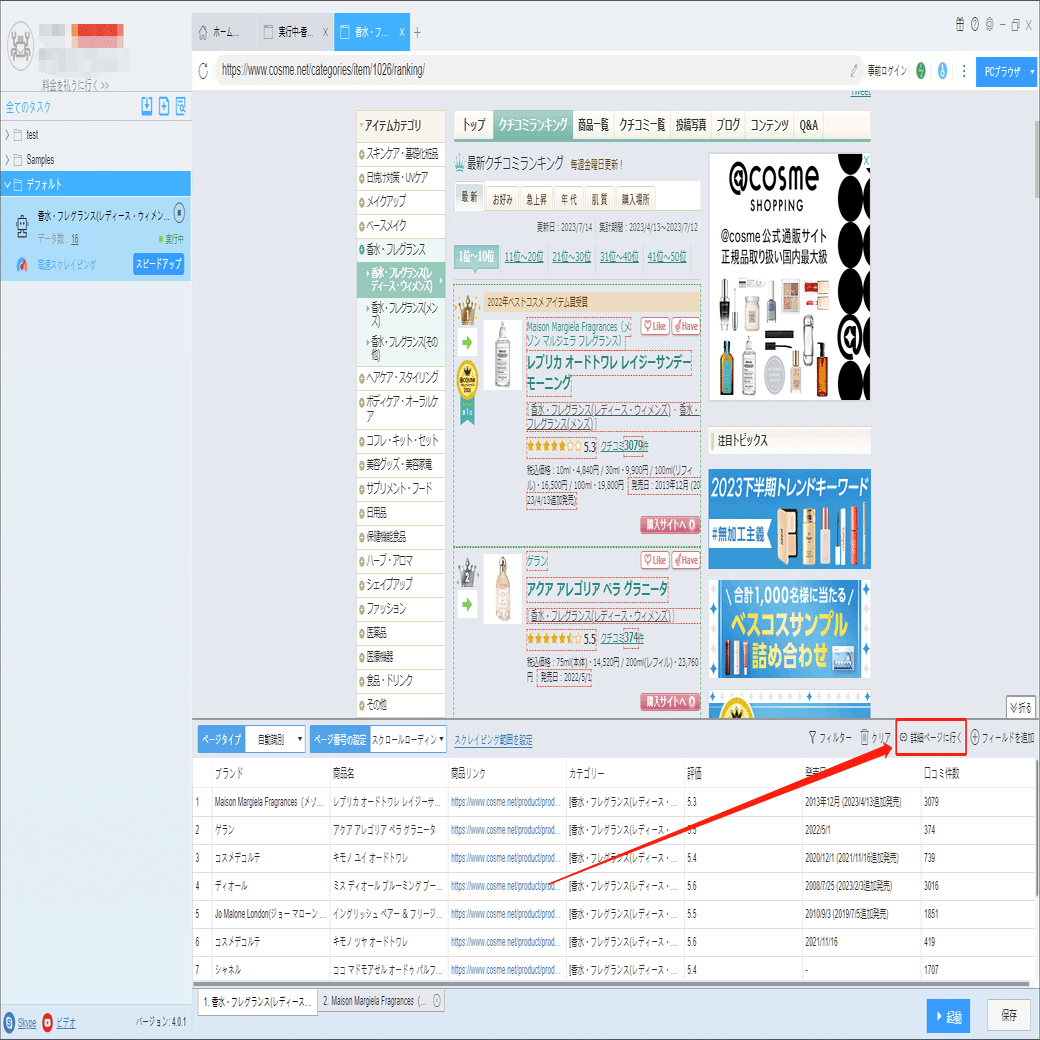 注目人数、商品説明などの詳細情報は詳細ページに付いていますから、ソフトウェアの「詳細ページに行く」機能を利用して、データを抽出します。