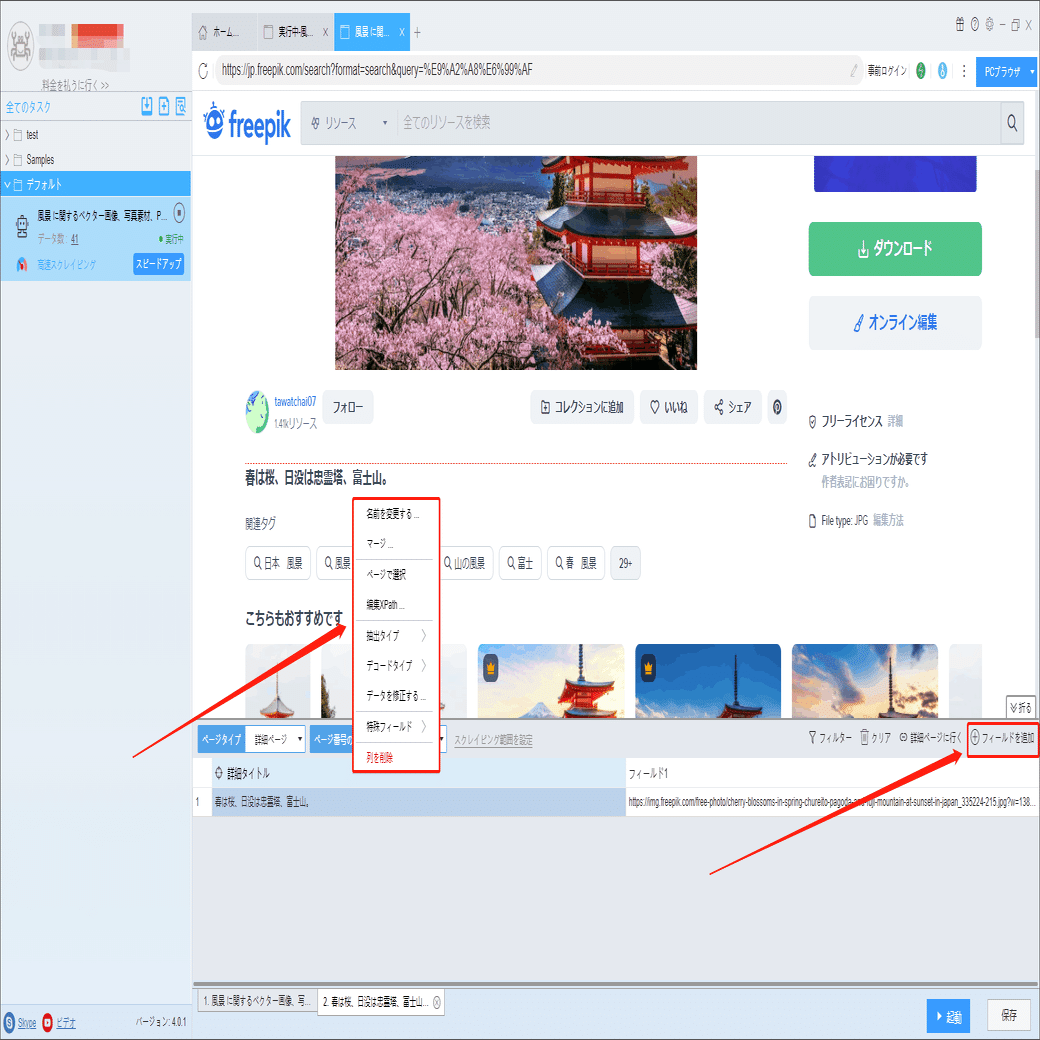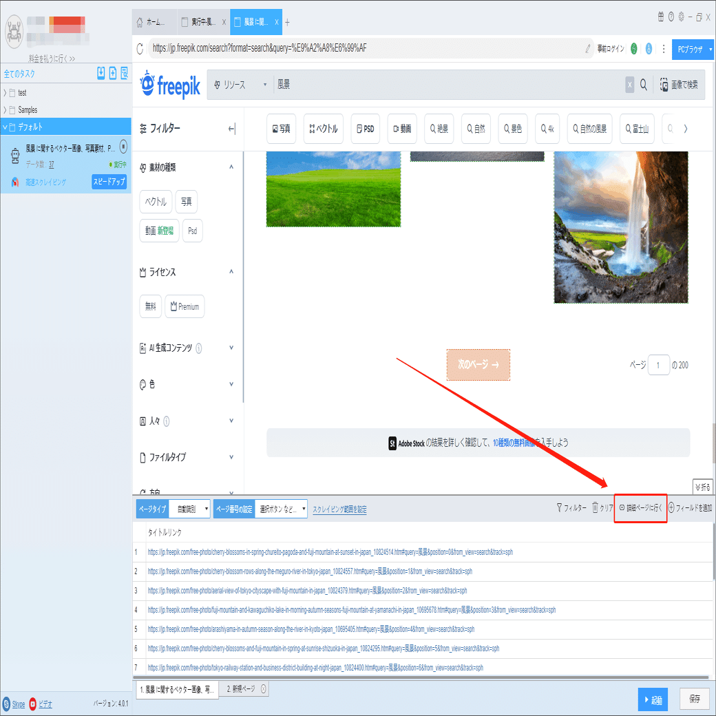 投稿者、タグなどの詳細情報は詳細ページに付いていますから、ソフトウェアの「詳細ページに行く」機能を利用して、データを抽出します。