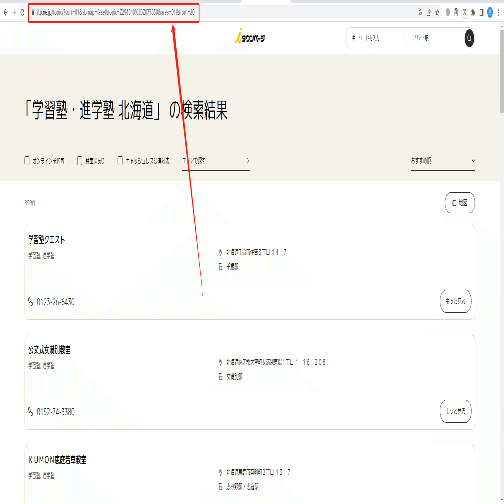 まず、抽出したいエリアを選んで、その検索結果の第二ページのURLをコピーしてください。