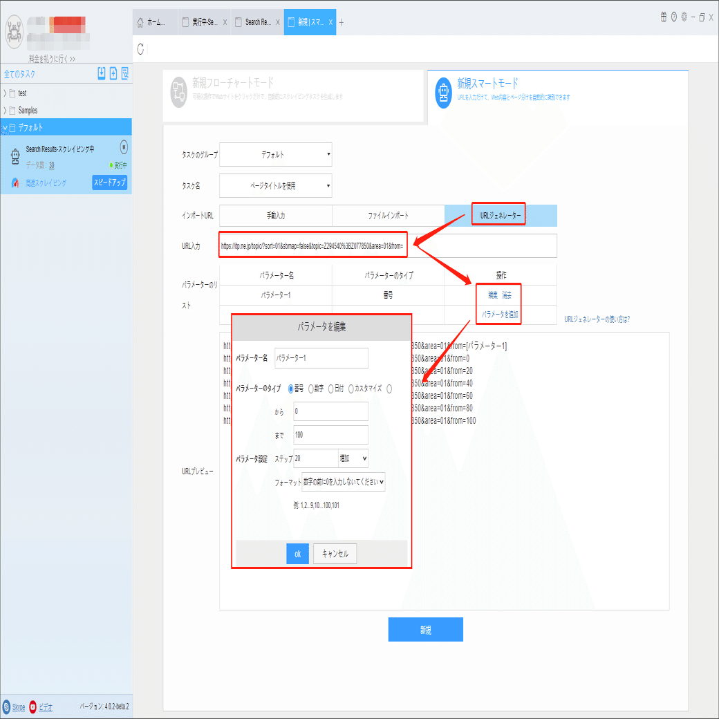 2ページ目のリンクの最後の番号は20、3ページ目は40、4ページ目は60であるため、パラメータ設定は0から始まり、100まで、ステップは20です。生成したURLはプレビュー画面でチェックしてください。