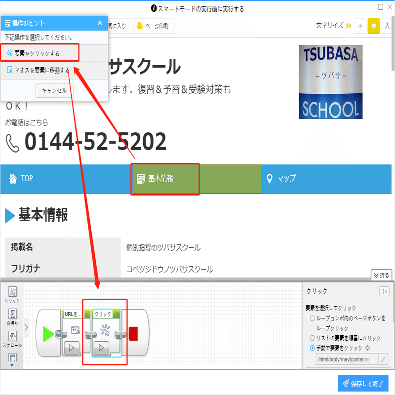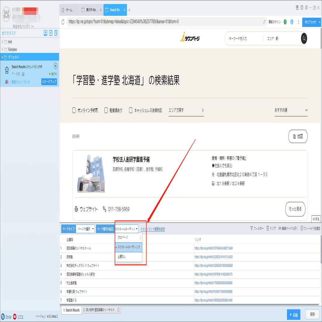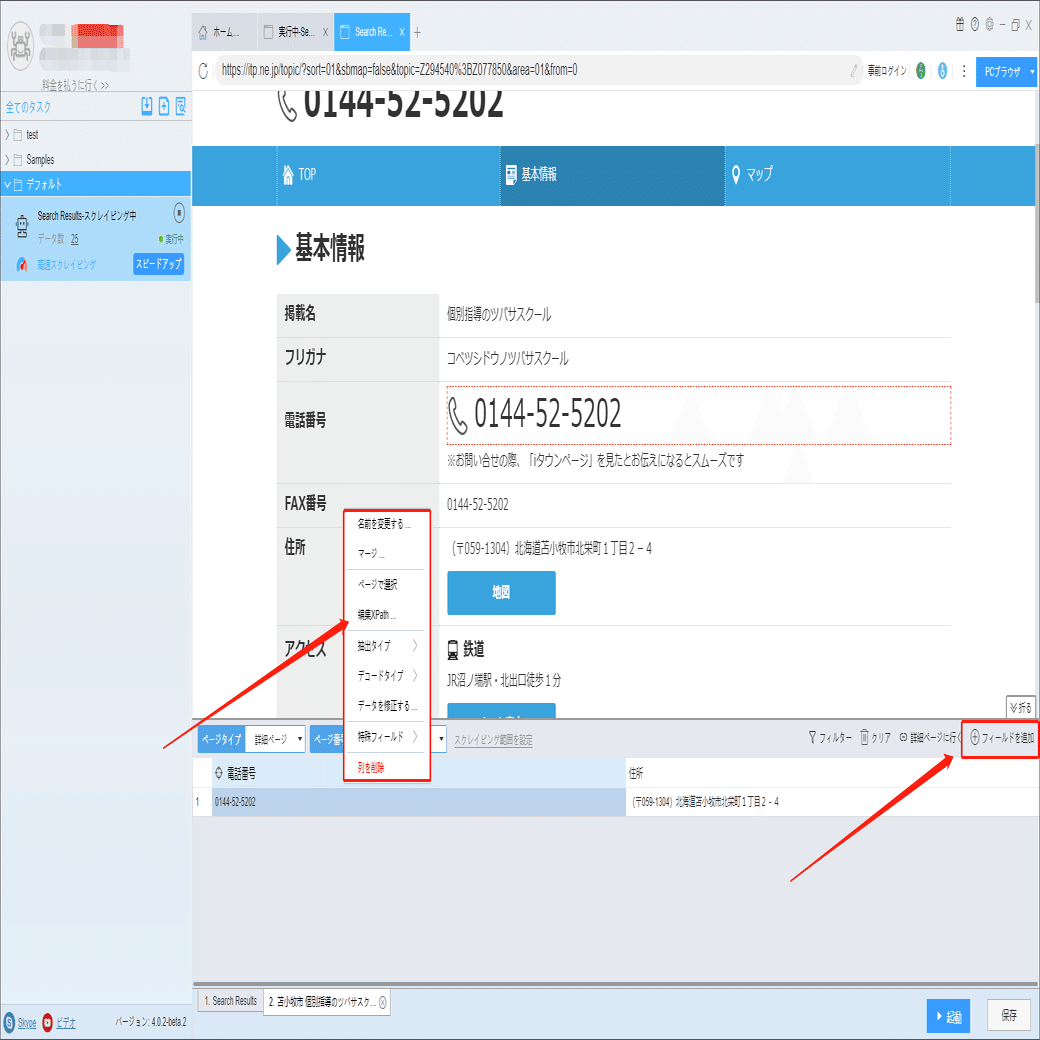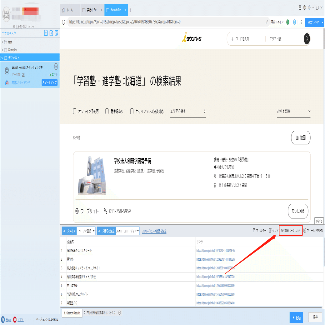 電話番号、住所などの詳細情報は詳細ページに付いていますから、ソフトウェアの「詳細ページに行く」機能を利用して、データを抽出します。