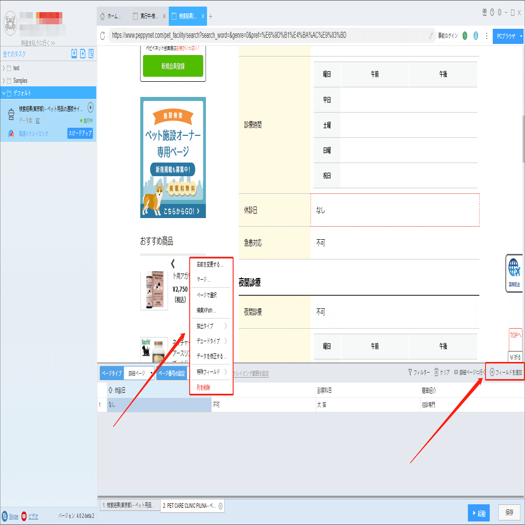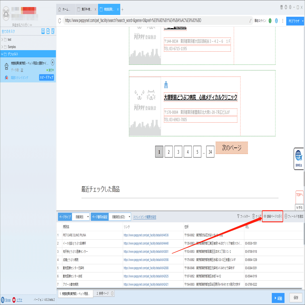 「詳細ページに行く」ボタンをクリックして、動物病院の詳細情報ページに移動します。診察科目、休診日、急患対応などの情報を抽出できます。
