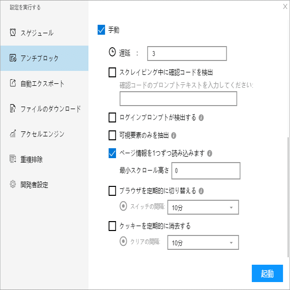 必要に応じて、スケジュール、アンチブロック、自動エクスポート、写真のダウンロード、スピードブーストを設定できます。サーバーに負荷しないように、遅延時間を設定してください。5秒以上を推薦します。スクレイピングタスクを配置する方法については、下記のチュートリアルをご参照ください。