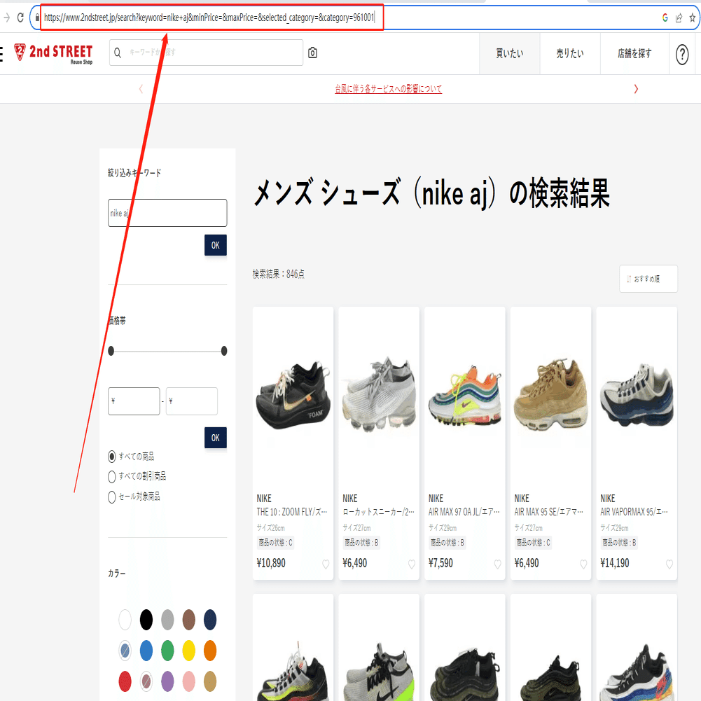 今回はnike ajをキーワードとして、その検索結果一覧ページのスクレイピング方法を紹介します。まず、URLをコピーしてください。