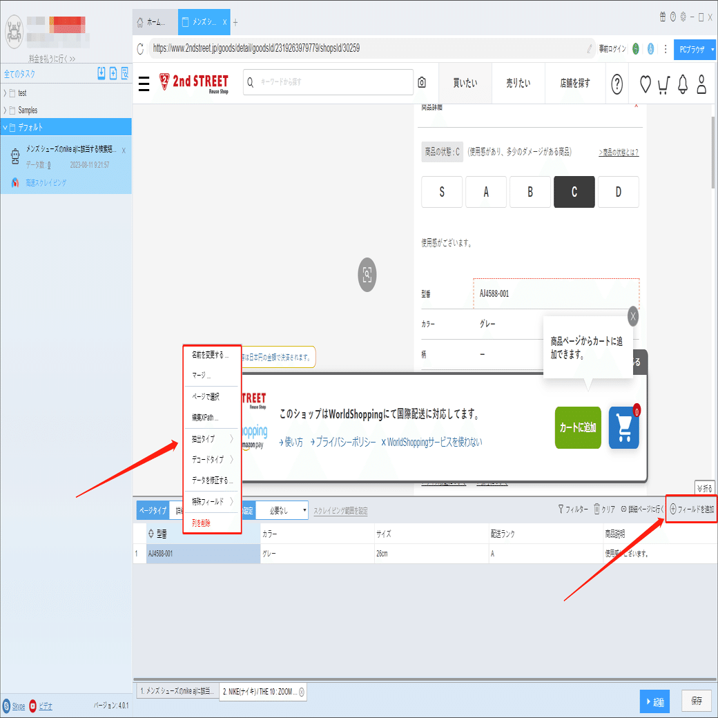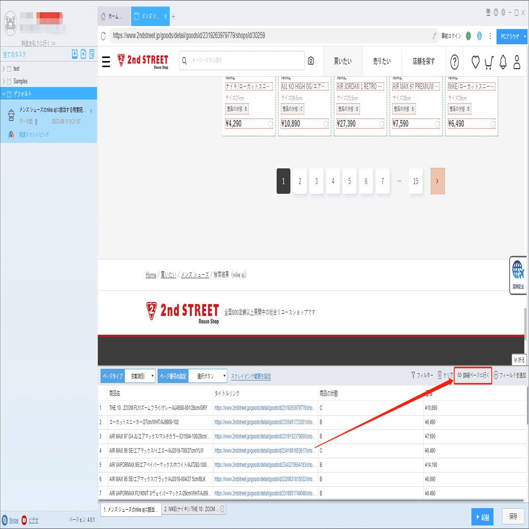 型番、商品状態、配送ランクなどの詳細情報は詳細ページに付いていますから、ソフトウェアの「詳細ページに行く」機能を利用して、データを抽出します。
