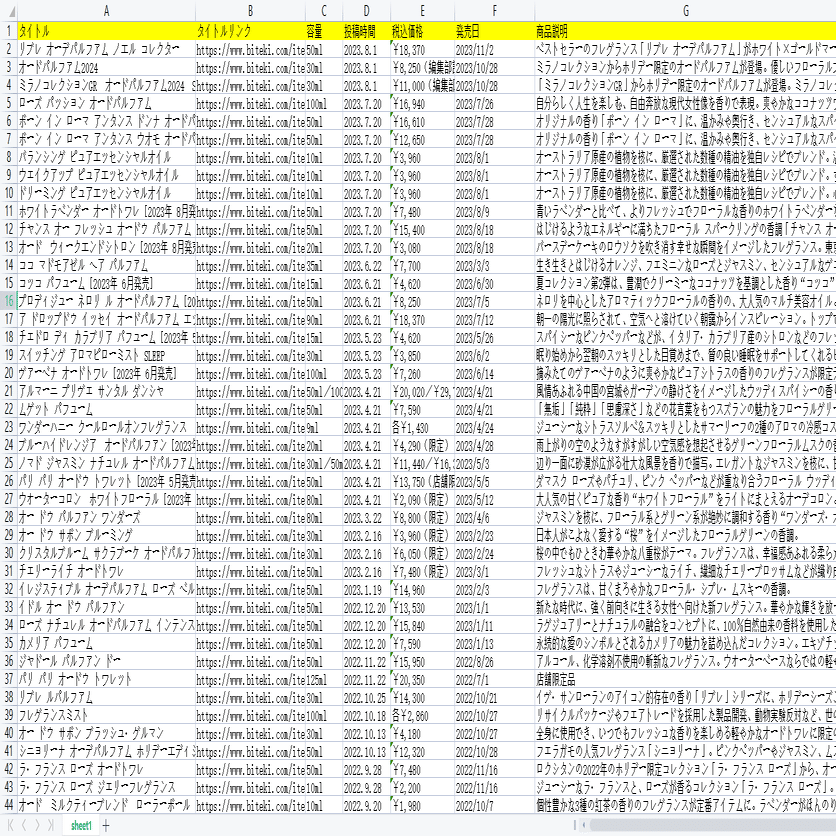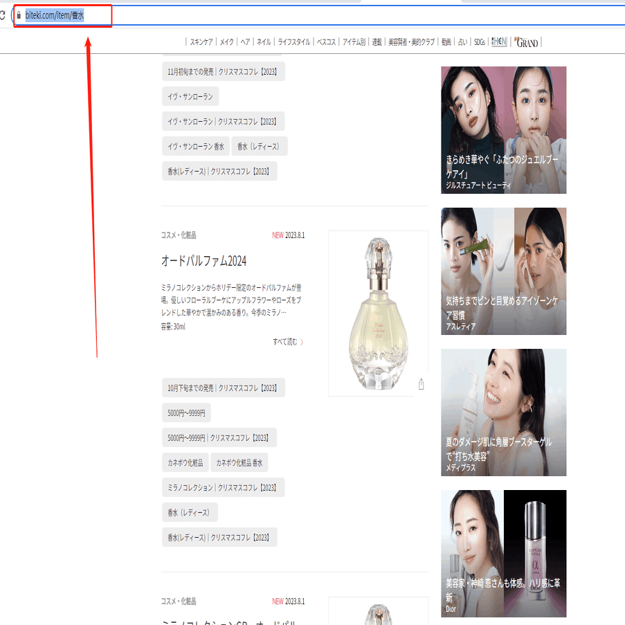 今回は香水の一覧ページを例として、スクレイピング方法を紹介します。まず、URLをコピーしてください。