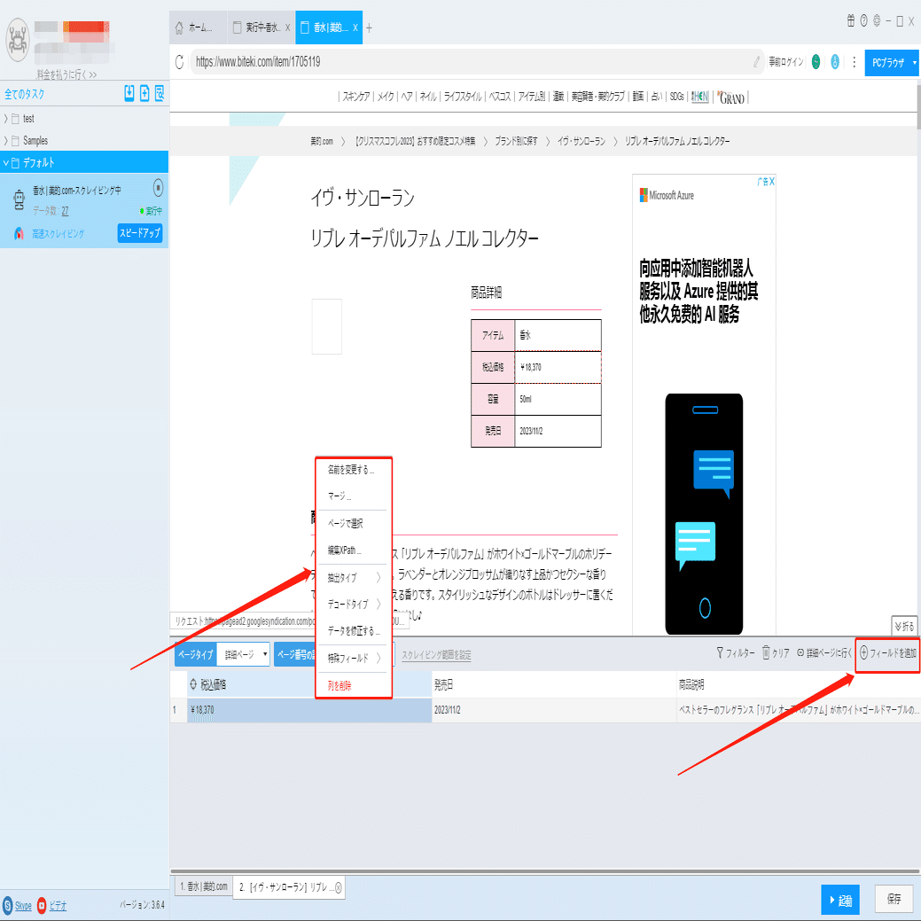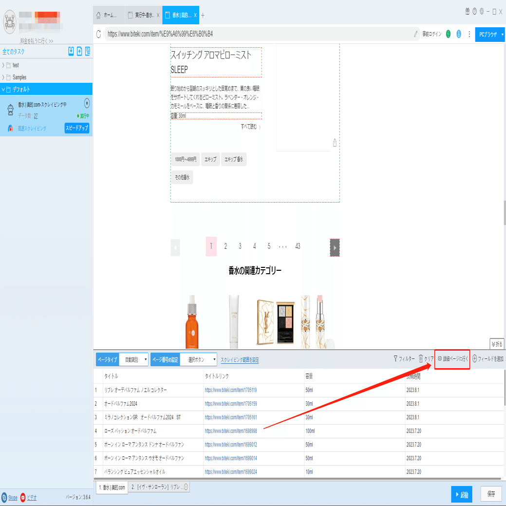 税込価格、商品説明などの詳細情報は詳細ページに付いていますから、ソフトウェアの「詳細ページに行く」機能を利用して、データを抽出します。