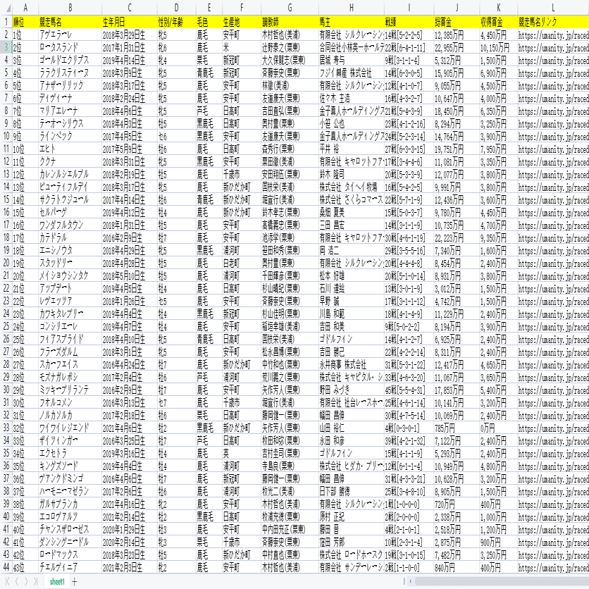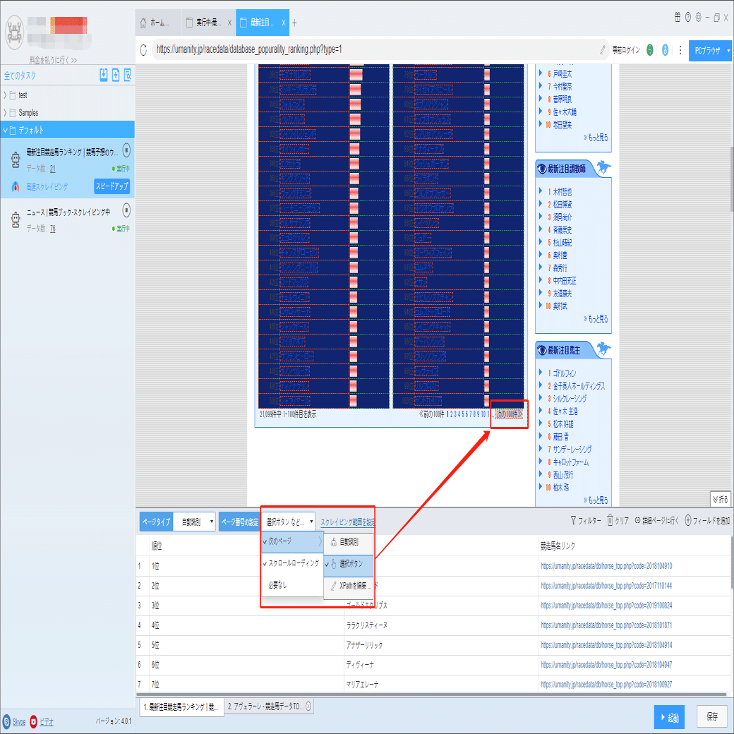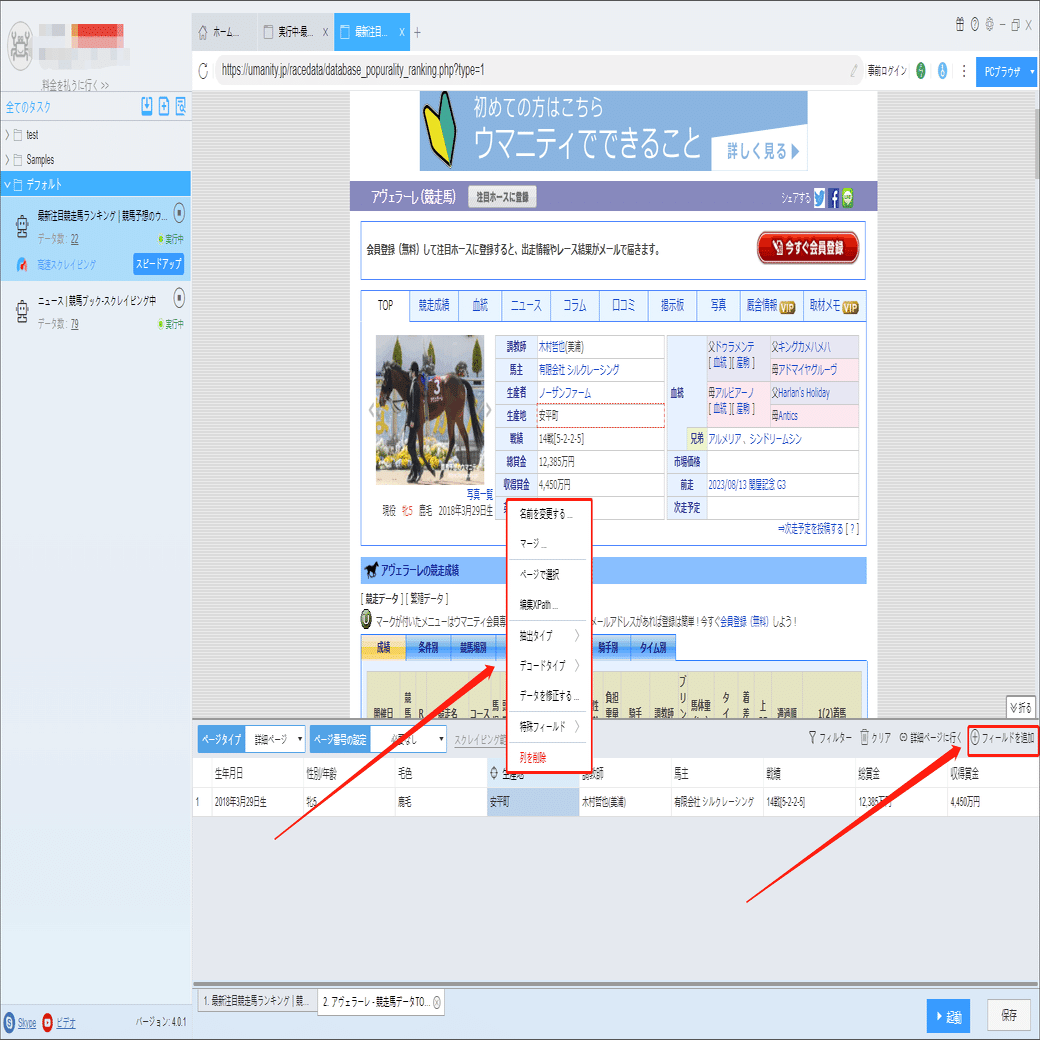 調教師、馬主、戦績、総賞金などの詳細情報は詳細ページに付いていますから、ソフトウェアの「詳細ページに行く」機能を利用して、データを抽出します。