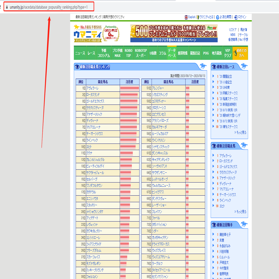 今回は最新注目競走馬ランキングページのスクレイピング方法を紹介します。まず、URLをコピーしてください。