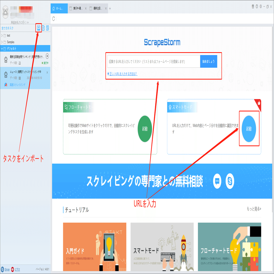 ScrapeStormのホムページ画面にスマートモードタスクを新規作成します。また、持っているタスクをインポートすることもできます。
