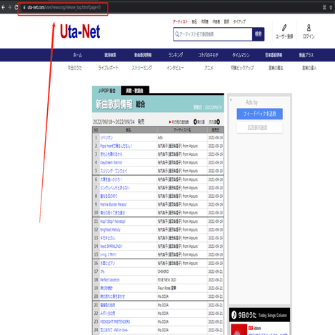今回は新曲歌詞情報ページを例として、スクレイピング方法を紹介します。まず、URLをコピーしてください。