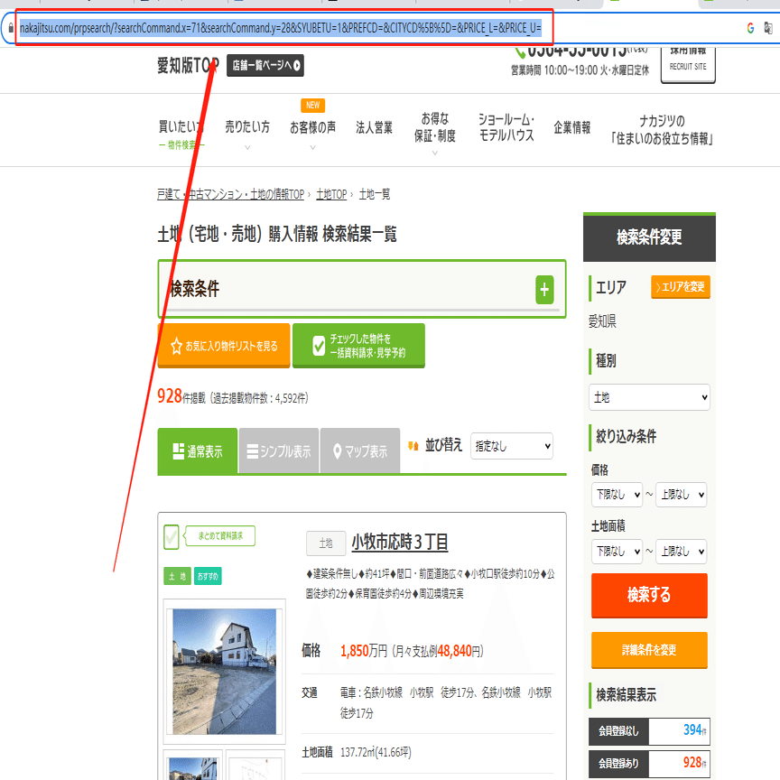 今回は土地(宅地・売地)購入情報検索結果ページを例として、スクレイピング方法を紹介します。まず、URLをコピーしてください。
