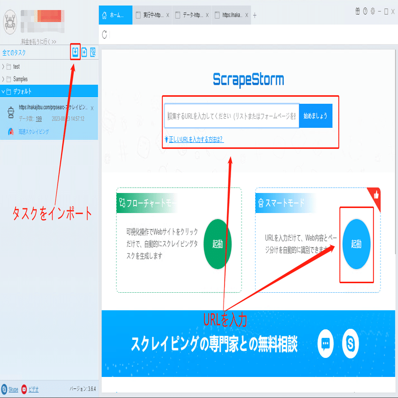 ScrapeStormのホムページ画面にスマートモードタスクを新規作成します。また、持っているタスクをインポートすることもできます。