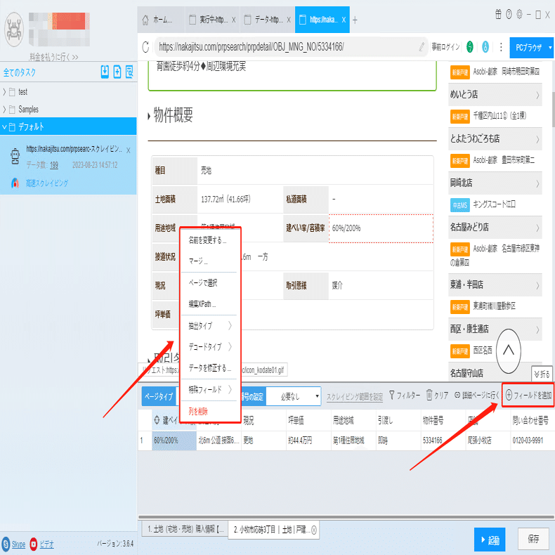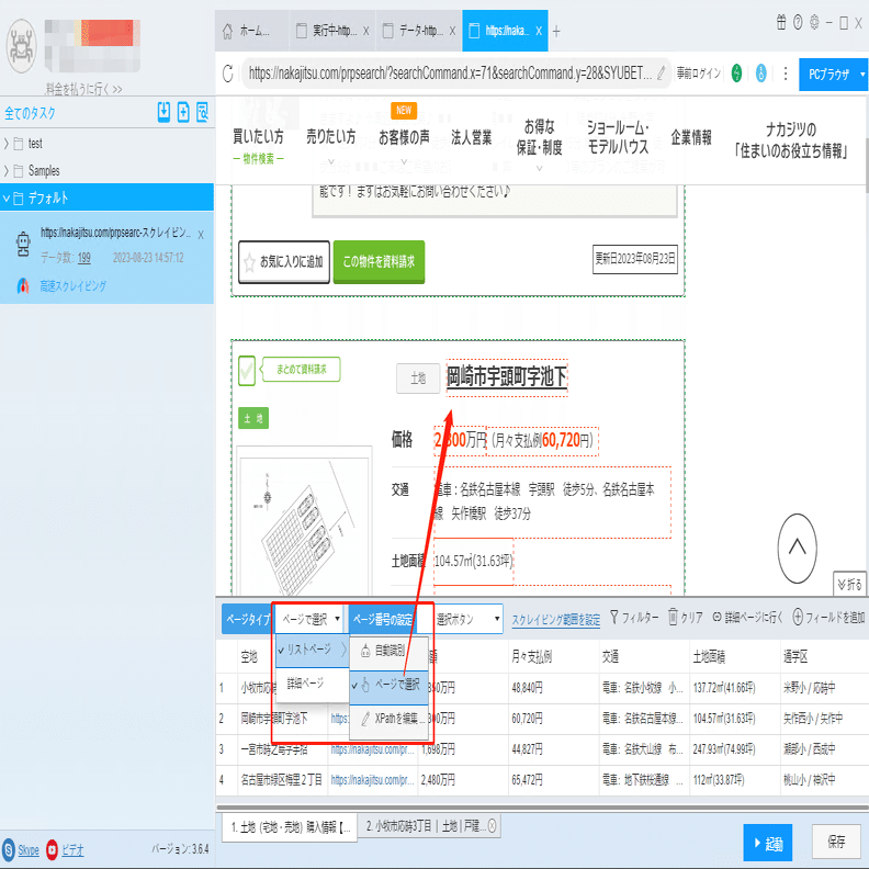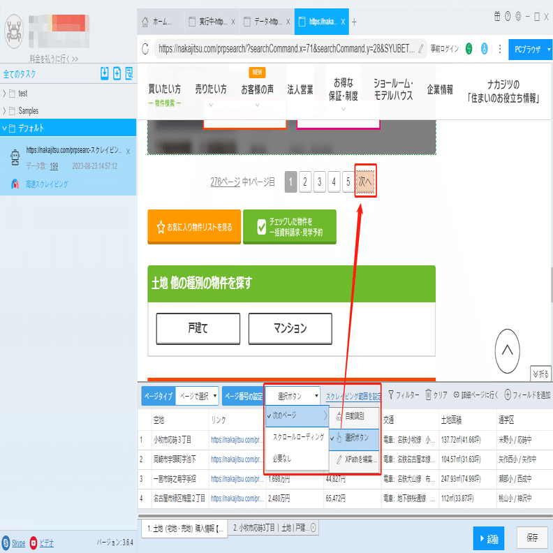 接道状況、現況、引渡時期などの詳細情報は詳細ページに付いていますから、ソフトウェアの「詳細ページに行く」機能を利用して、データを抽出します。
