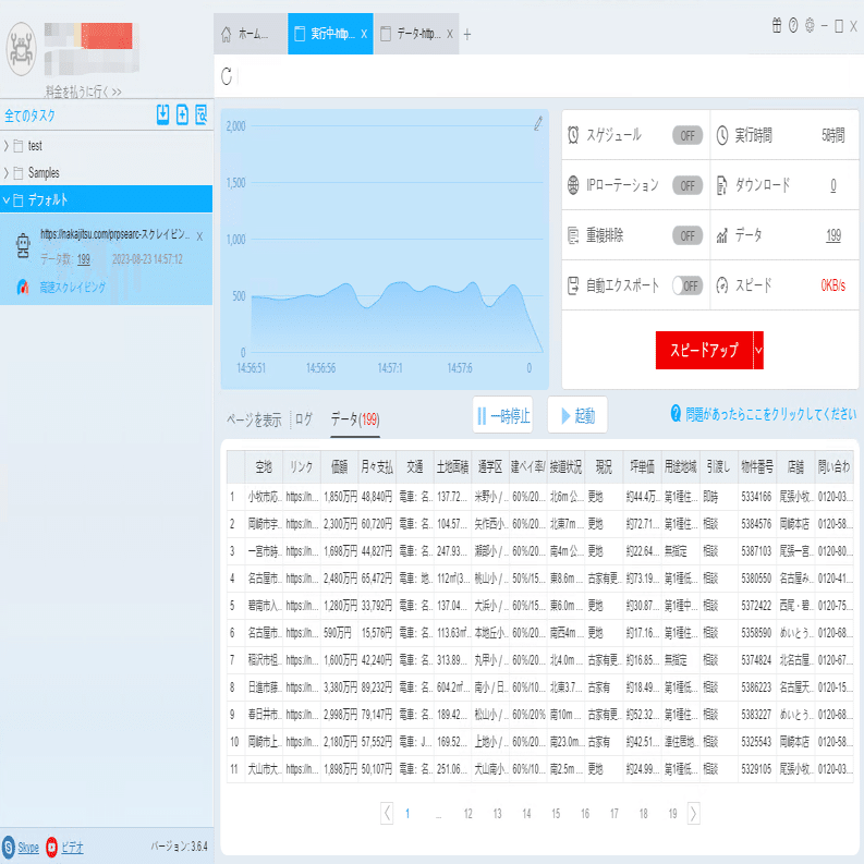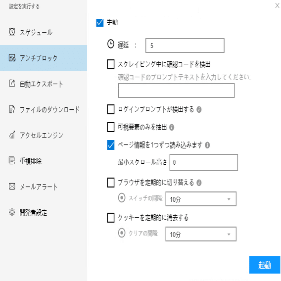 必要に応じて、スケジュール、アンチブロック、自動エクスポート、写真のダウンロード、スピードブーストを設定できます。サーバーに負荷しないように、遅延時間を設定してください。5秒以上を推薦します。スクレイピングタスクを配置する方法については、下記のチュートリアルをご参照ください。