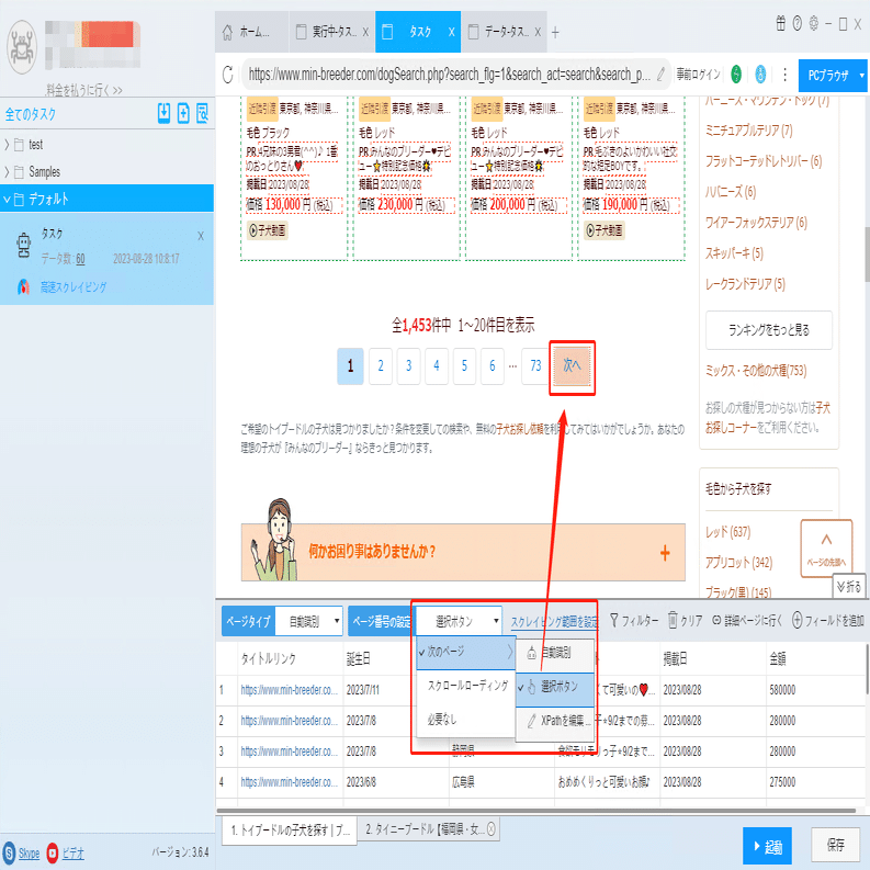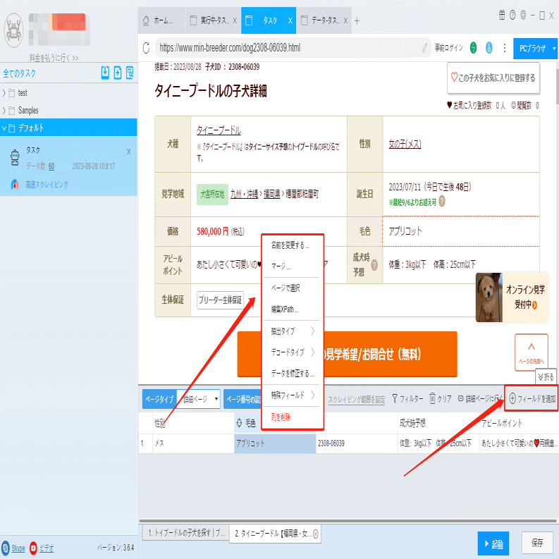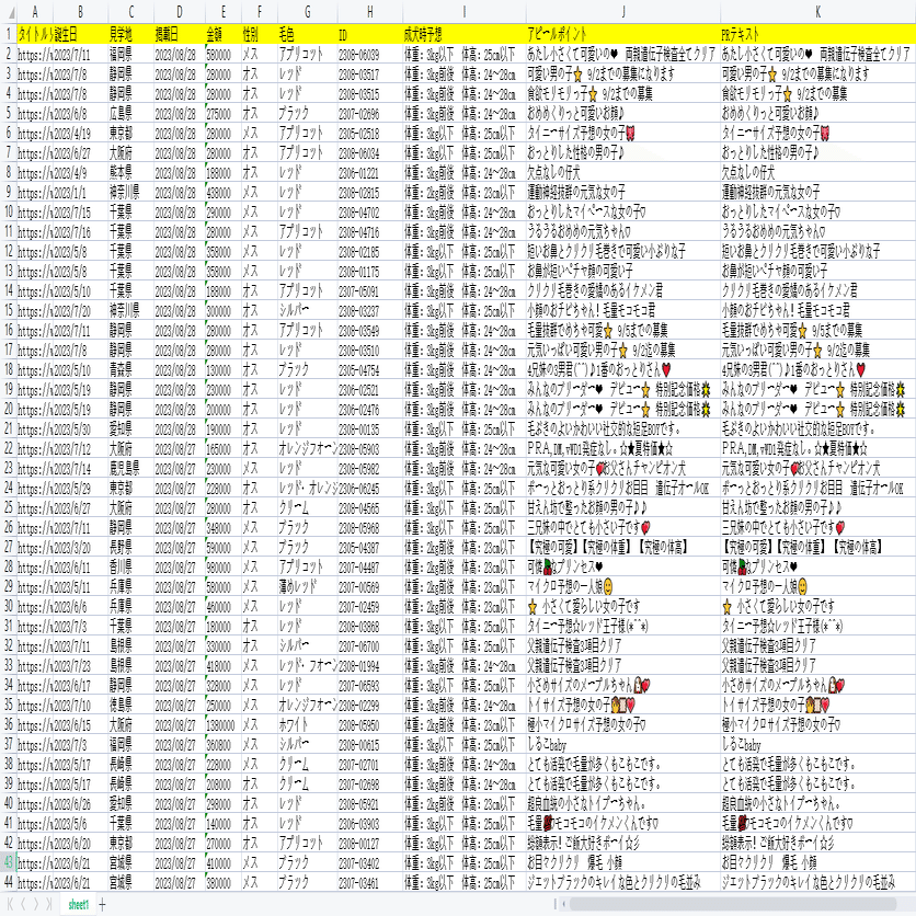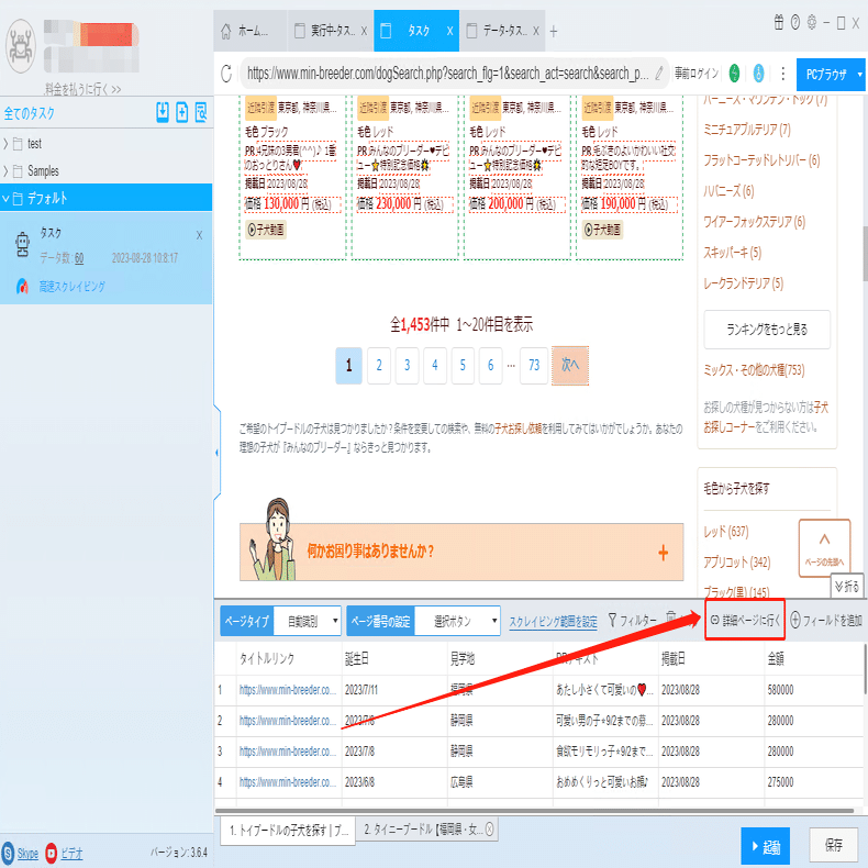 毛色、成犬時予想、アピールポイントなどの詳細情報は詳細ページに付いていますから、ソフトウェアの「詳細ページに行く」機能を利用して、データを抽出します。