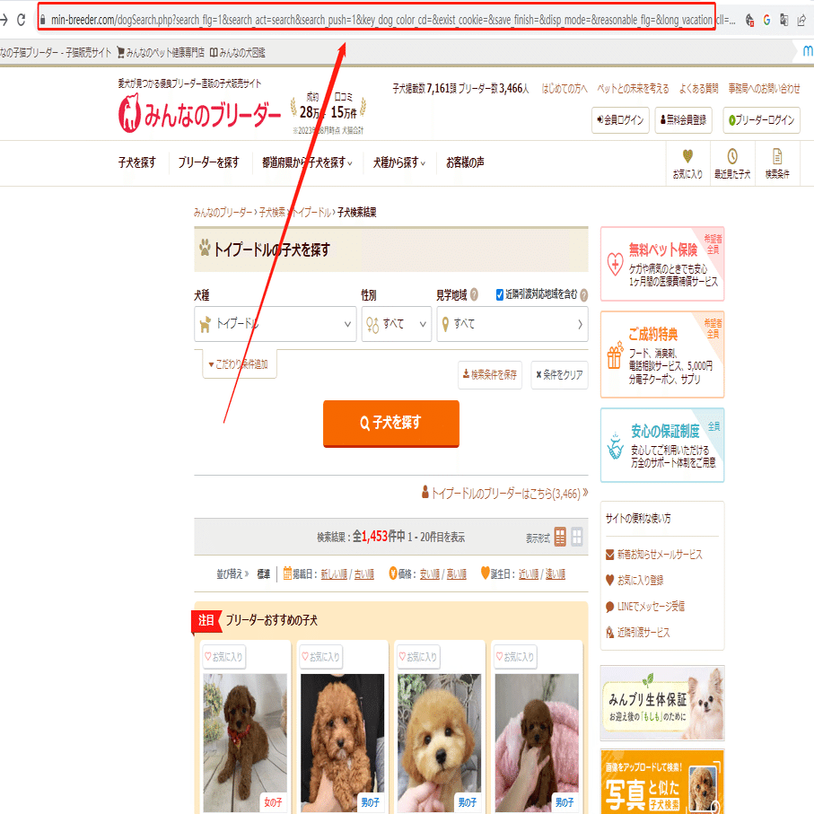 今回はトイプードルをキーワードとして、その検索結果ページのスクレイピング方法を紹介します。まず、URLをコピーしてください。