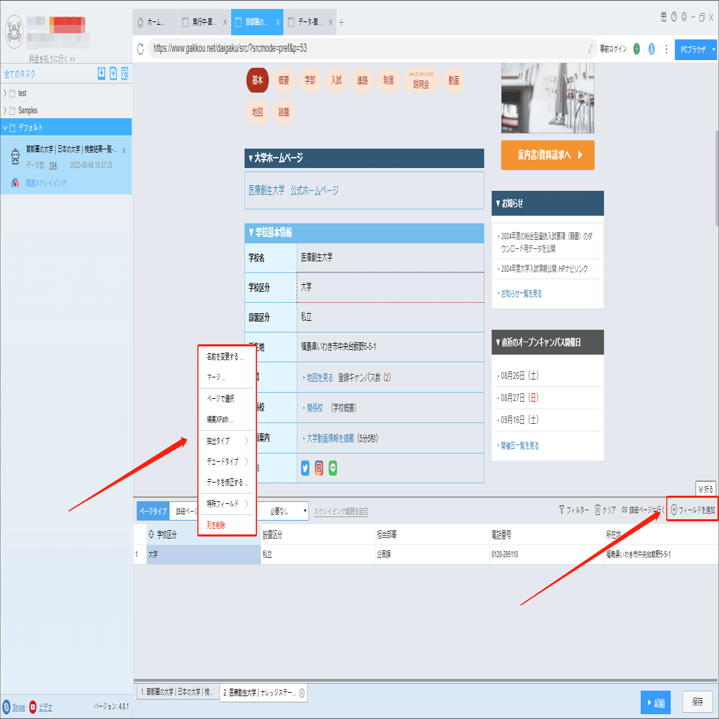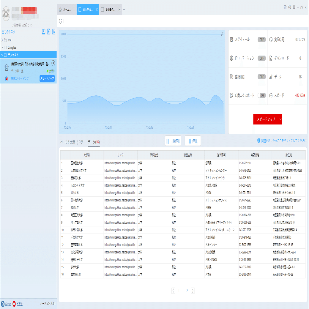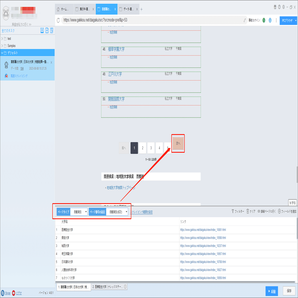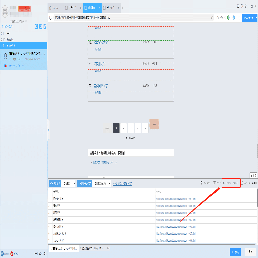 学校区分、所在地、担当部署、連絡電話番号などの詳細情報は詳細ページに付いていますから、ソフトウェアの「詳細ページに行く」機能を利用して、データを抽出します。