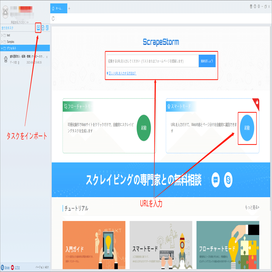 ScrapeStormのホムページ画面にスマートモードタスクを新規作成します。また、持っているタスクをインポートすることもできます。