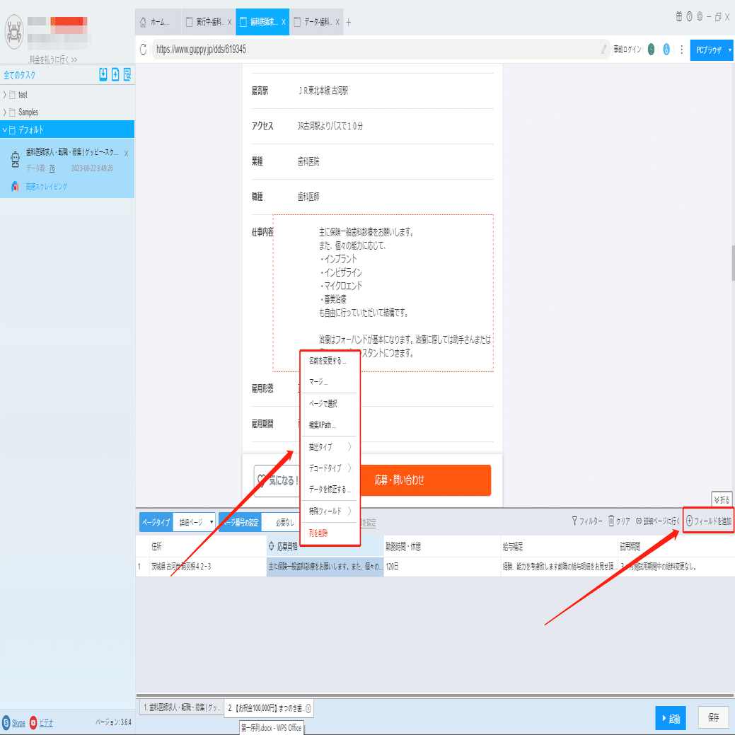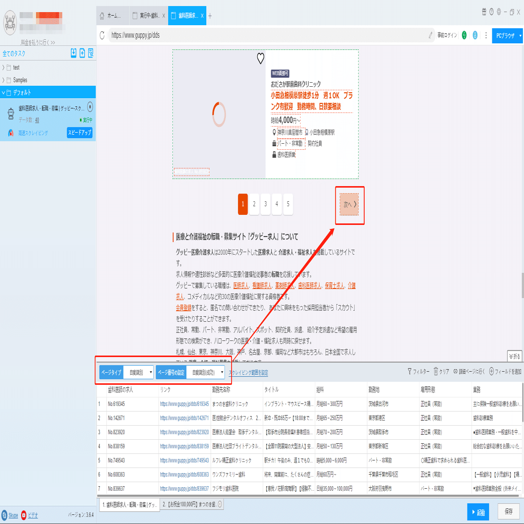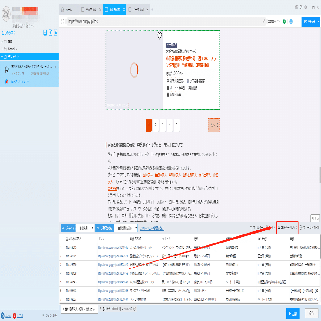 応募資格、試用期間、給与補足などの詳細情報は詳細ページに付いていますから、ソフトウェアの「詳細ページに行く」機能を利用して、データを抽出します。