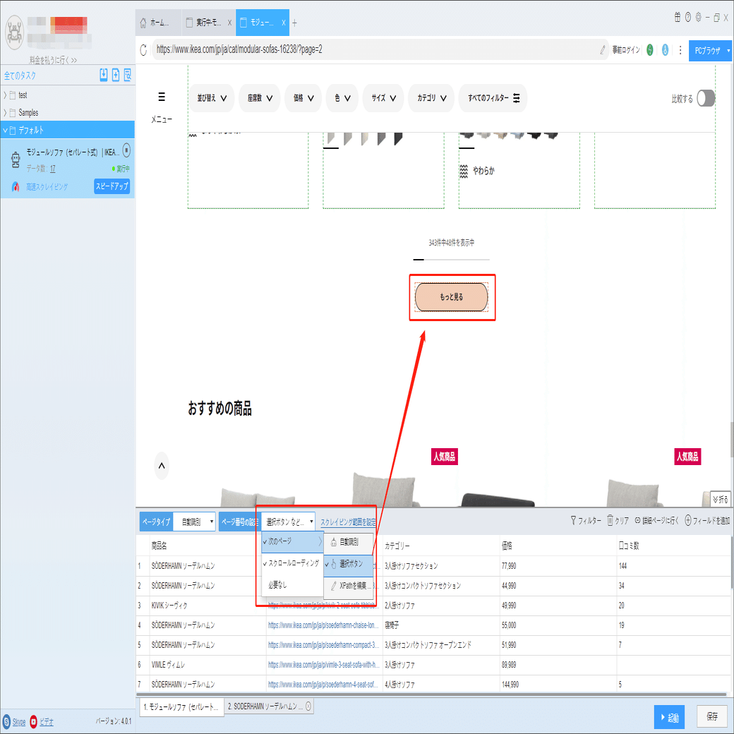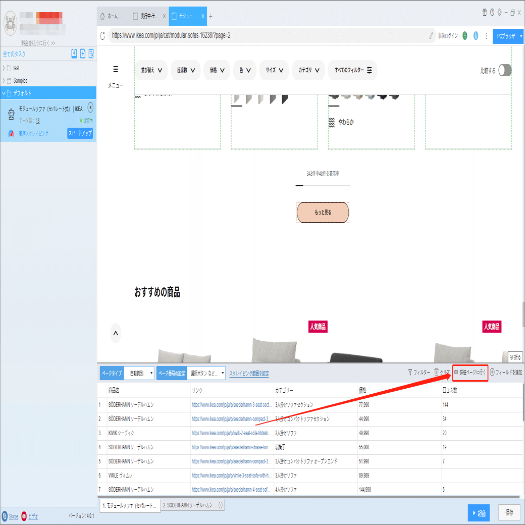 商品番号、商品説明などの詳細情報は詳細ページに付いていますから、ソフトウェアの「詳細ページに行く」機能を利用して、データを抽出します。