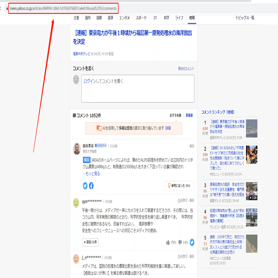 今回は福島第一原発処理水の海洋放出を決定に関するニュースのコメントページを例として、その検索結果一覧ページのスクレイピング方法を紹介します。まず、URLをコピーしてください。