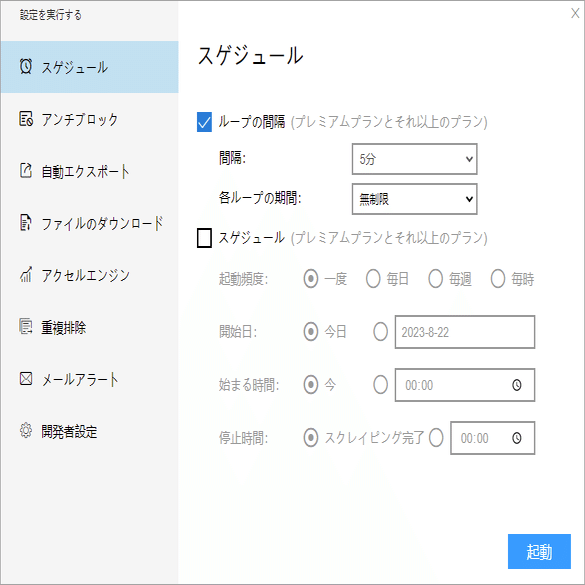 必要に応じて、スケジュール、アンチブロック、自動エクスポート、写真のダウンロード、スピードブーストを設定できます。