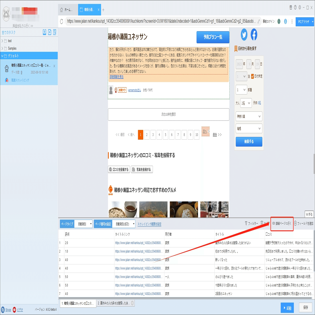 行った時間、滞在時間、混雑具合などの詳細情報は詳細ページに付いていますから、ソフトウェアの「詳細ページに行く」機能を利用して、データを抽出します。