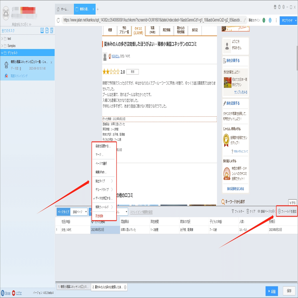 「フィールドを追加」ボタンをクリックして、画面に必要な要素を選択、データが自動的に抽出されます。また、必要に応じてフィールドの名前の変更または削除、結合できます。