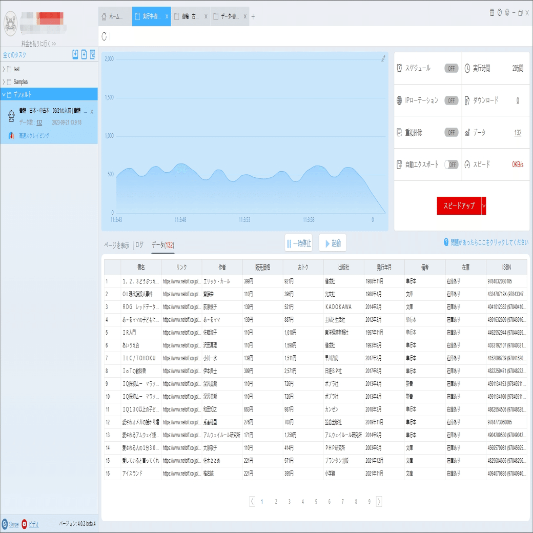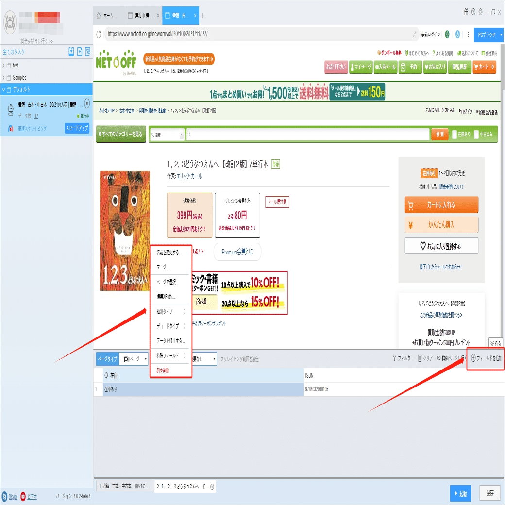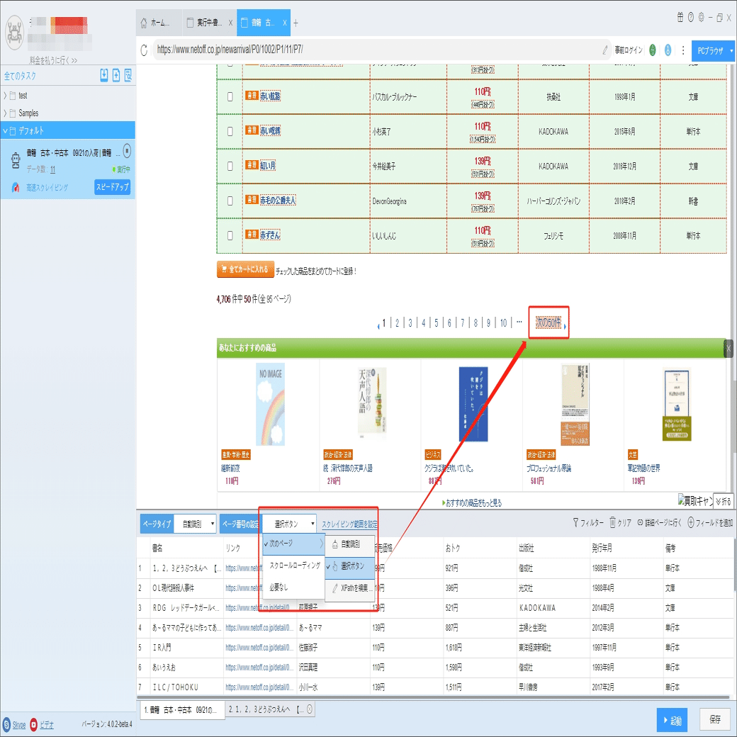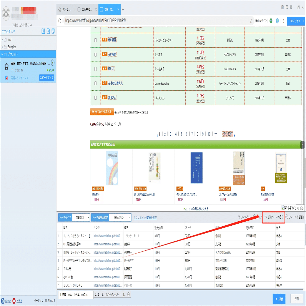 在庫、ISBNなどの詳細情報は詳細ページに付いていますから、ソフトウェアの「詳細ページに行く」機能を利用して、データを抽出します。