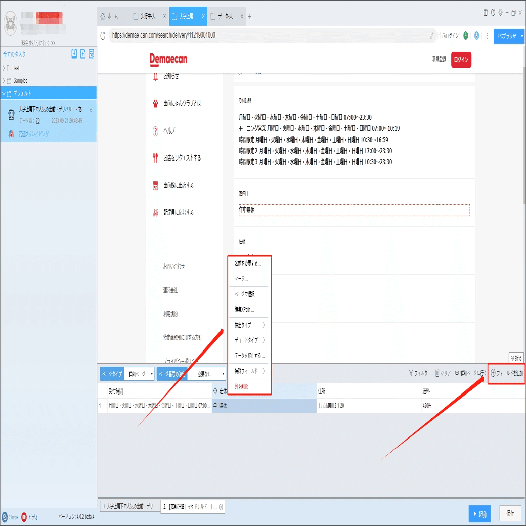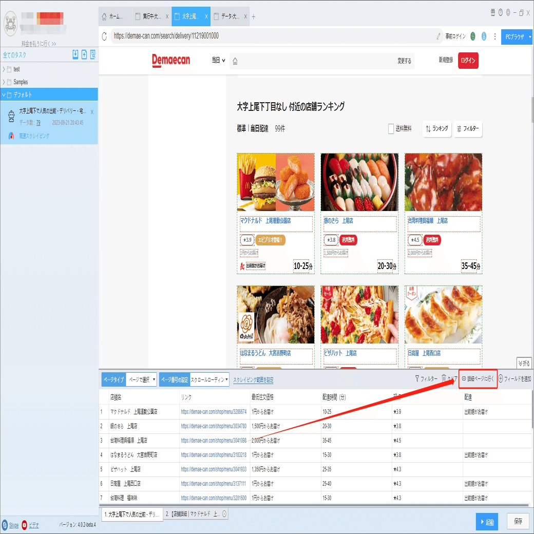 定休日、住所、送料などの詳細情報は詳細ページに付いていますから、ソフトウェアの「詳細ページに行く」機能を利用して、データを抽出します。