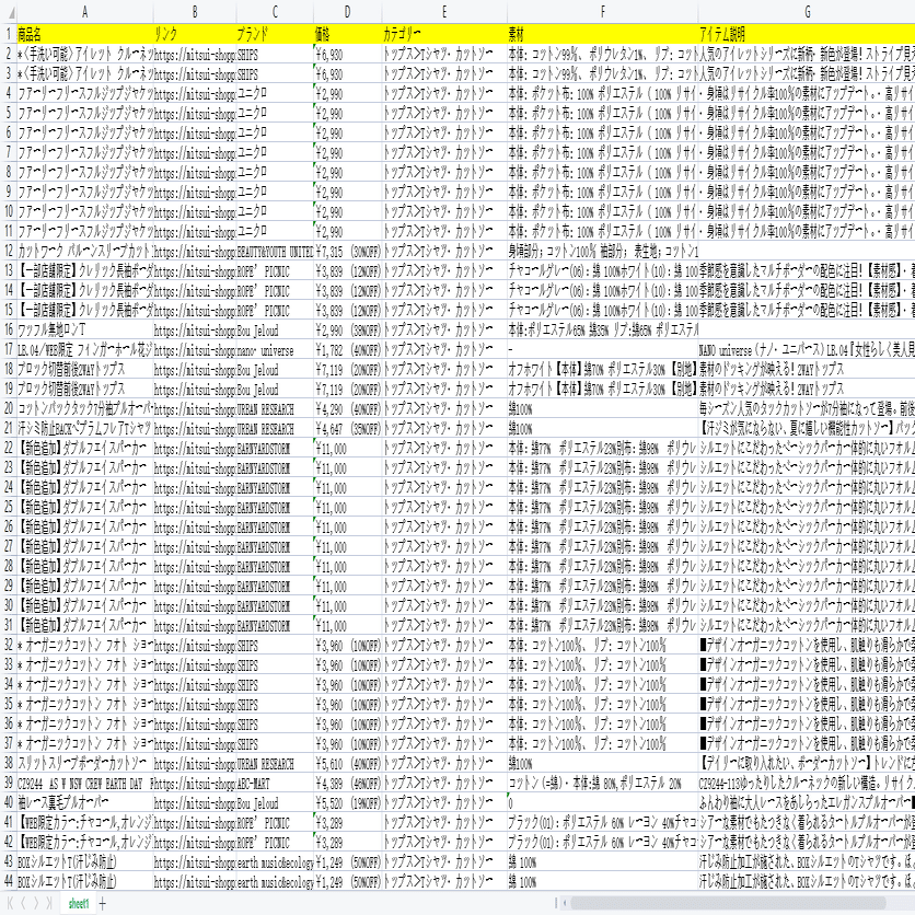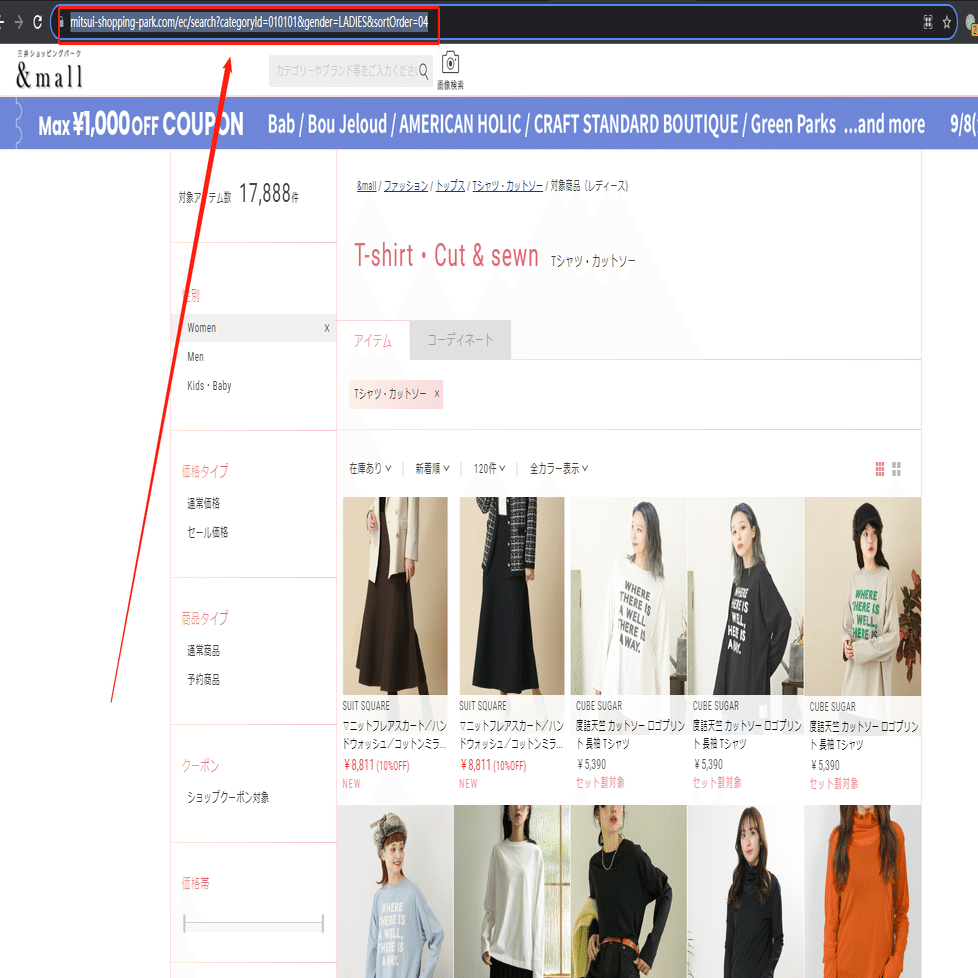 今回はTシャツ・カットソー一覧ページのスクレイピング方法を紹介します。まず、URLをコピーしてください。