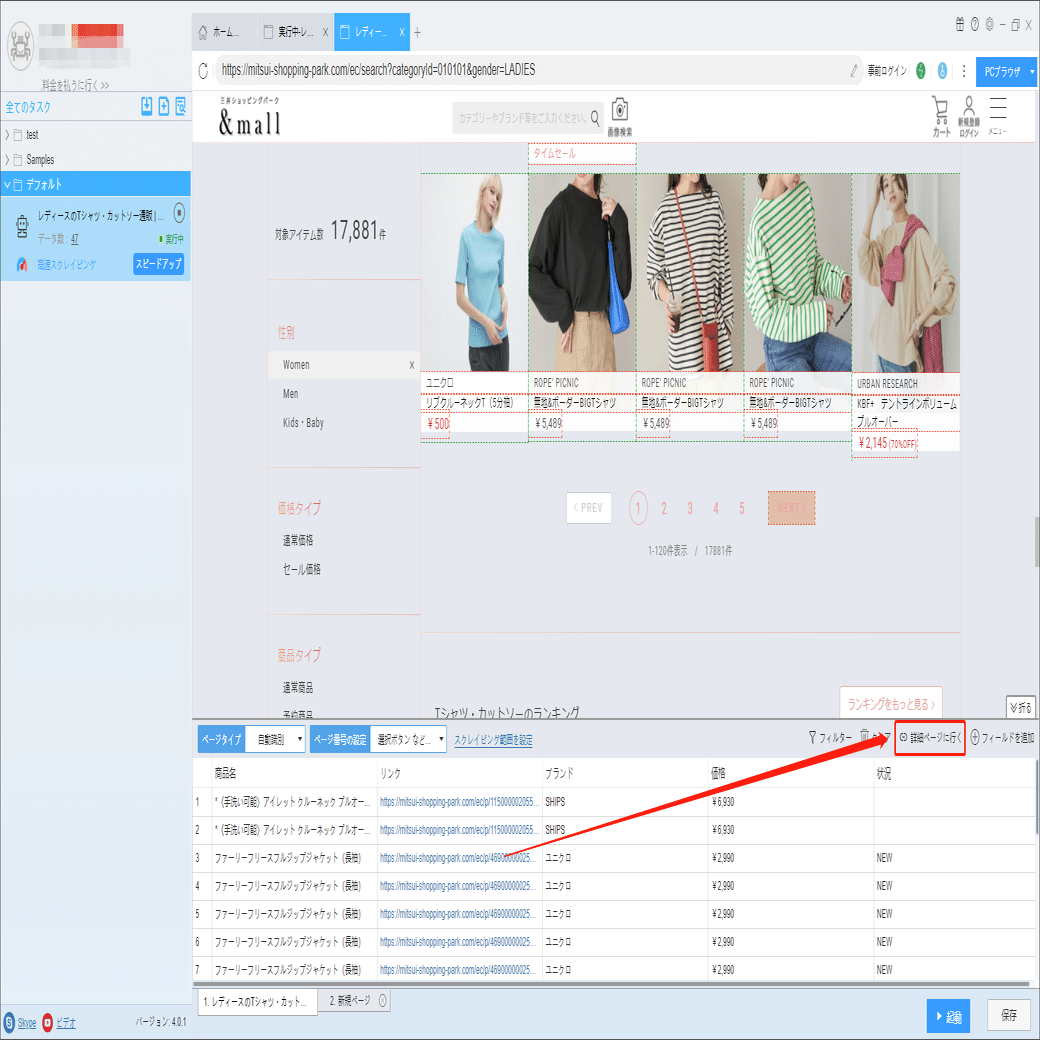 在庫、アイテム説明などの詳細情報は詳細ページに付いていますから、ソフトウェアの「詳細ページに行く」機能を利用して、データを抽出します。