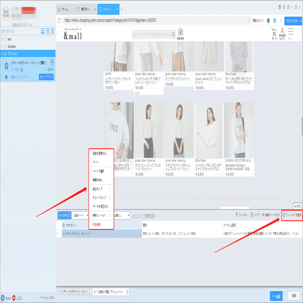 「フィールドを追加」ボタンをクリックして、画面に必要な要素を選択、データが自動的に抽出されます。また、必要に応じてフィールドの名前の変更または削除、結合できます。