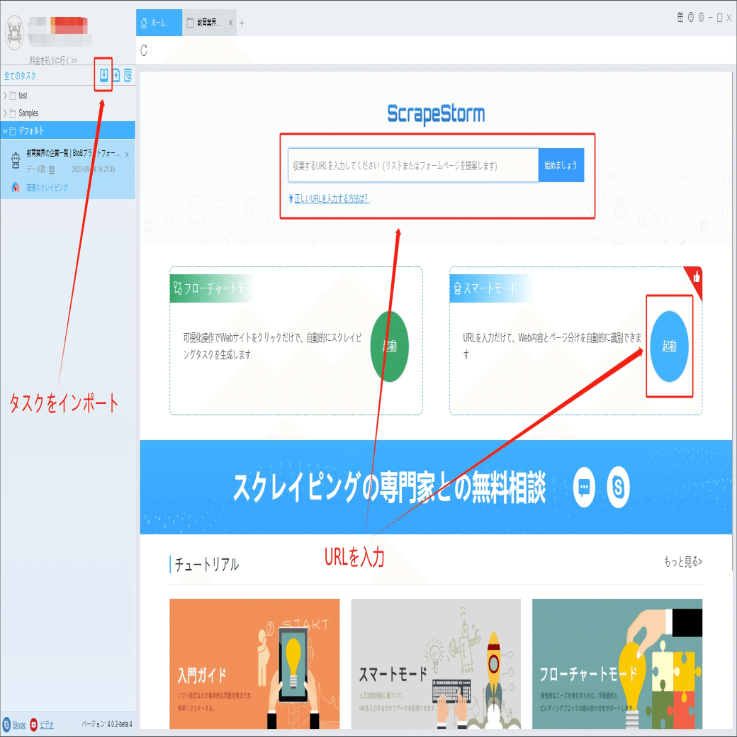 ScrapeStormのホムページ画面にスマートモードタスクを新規作成します。また、持っているタスクをインポートすることもできます。