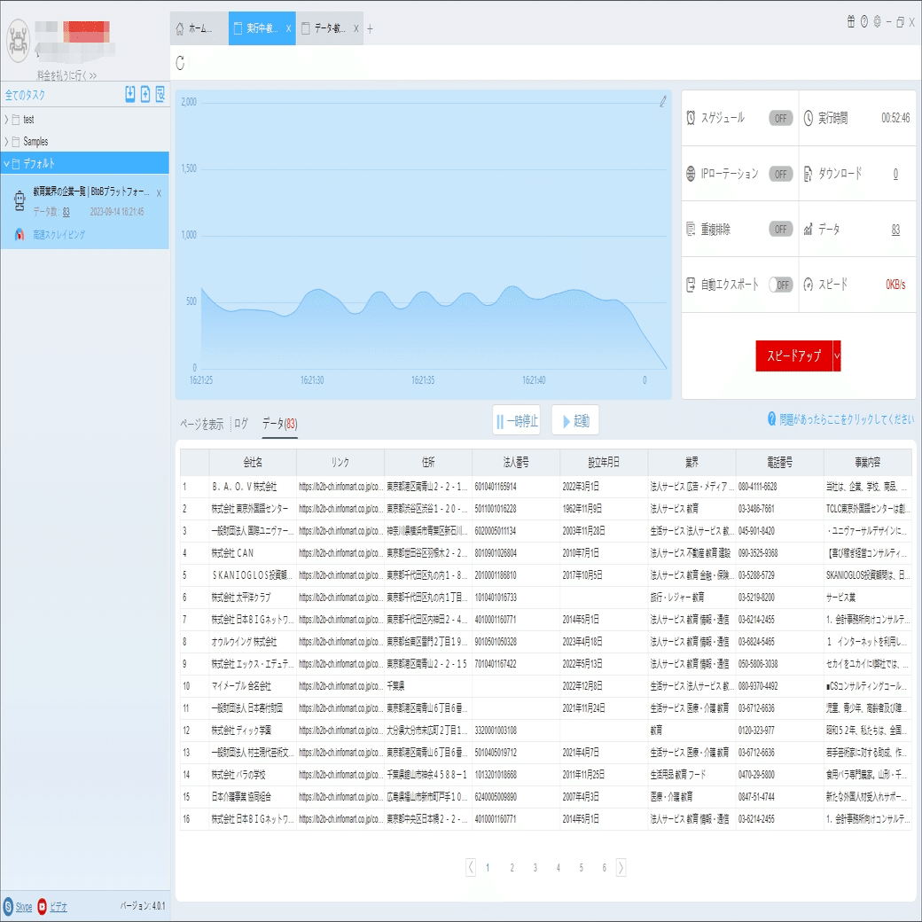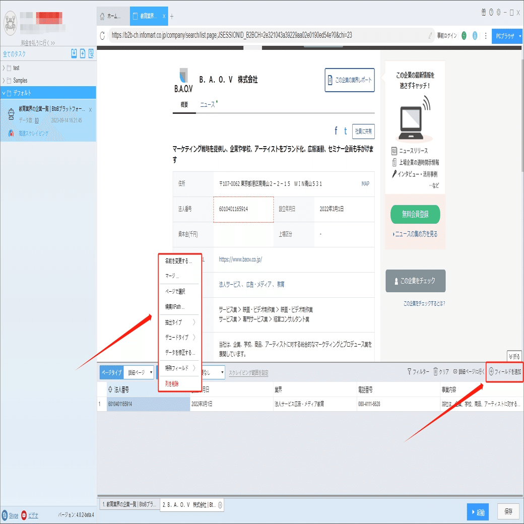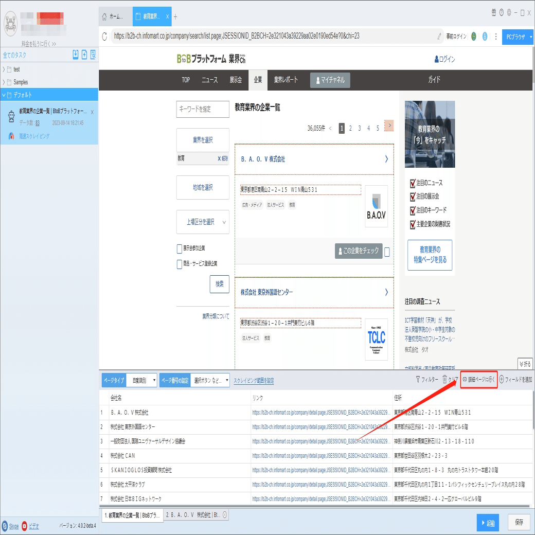 法人番号、設立年月日などの詳細情報は詳細ページに付いていますから、ソフトウェアの「詳細ページに行く」機能を利用して、データを抽出します。