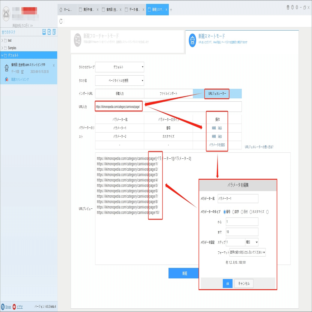 URLジェネレータでURLを入力して、パラメーターを追加画面にページ数を入力します。今回は10までです。生成したURLはプレビュー画面でチェックしてください。