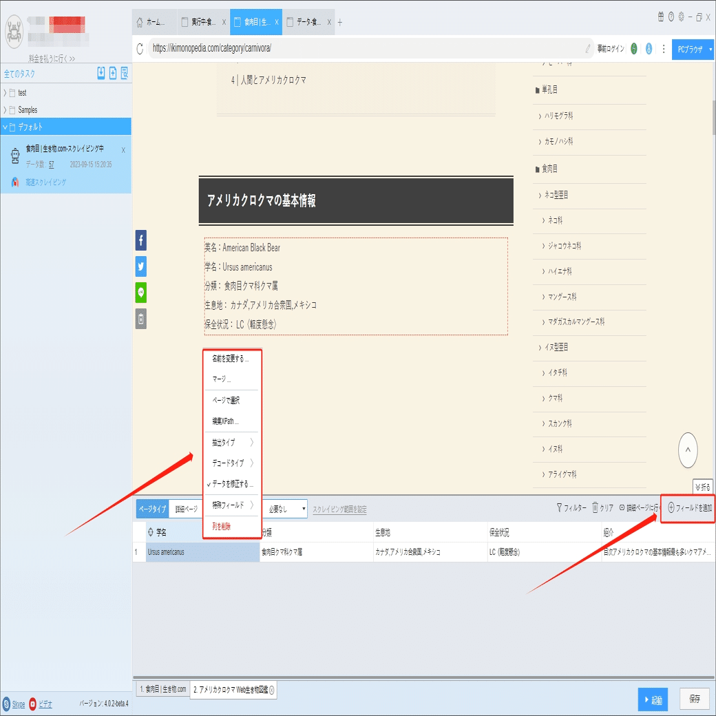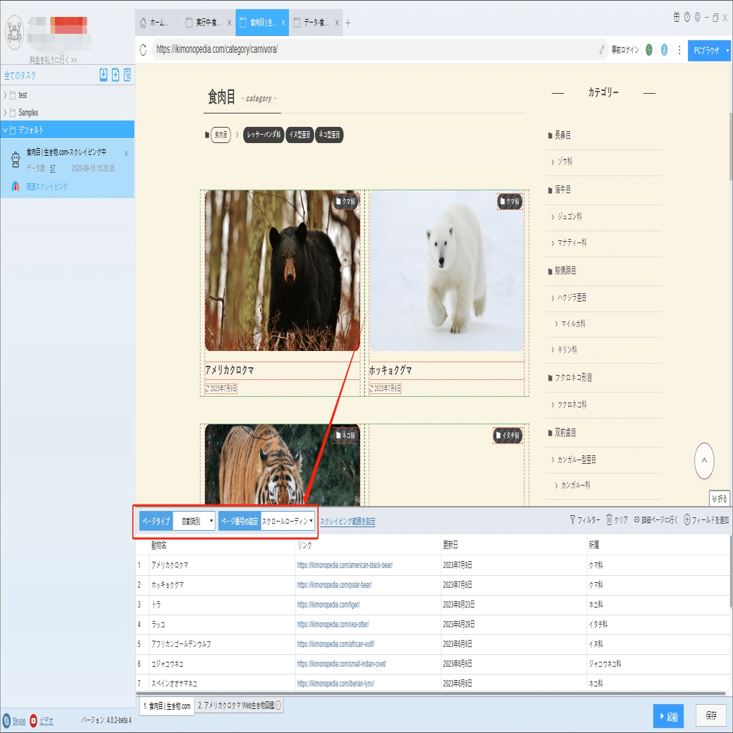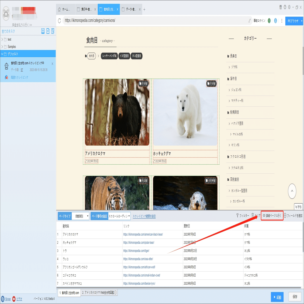 学名、分類、生息地、保全状況などの詳細情報は詳細ページに付いていますから、ソフトウェアの「詳細ページに行く」機能を利用して、データを抽出します。