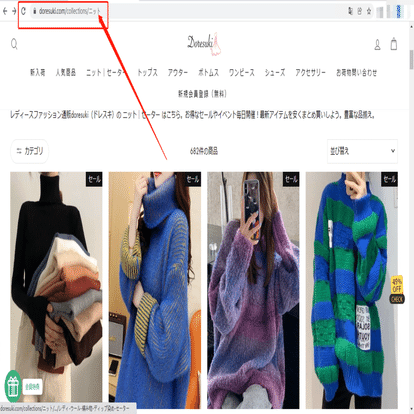 今回はニット、セーターの検索結果ページを例として、スクレイピング方法を紹介します。まず、URLをコピーしてください。