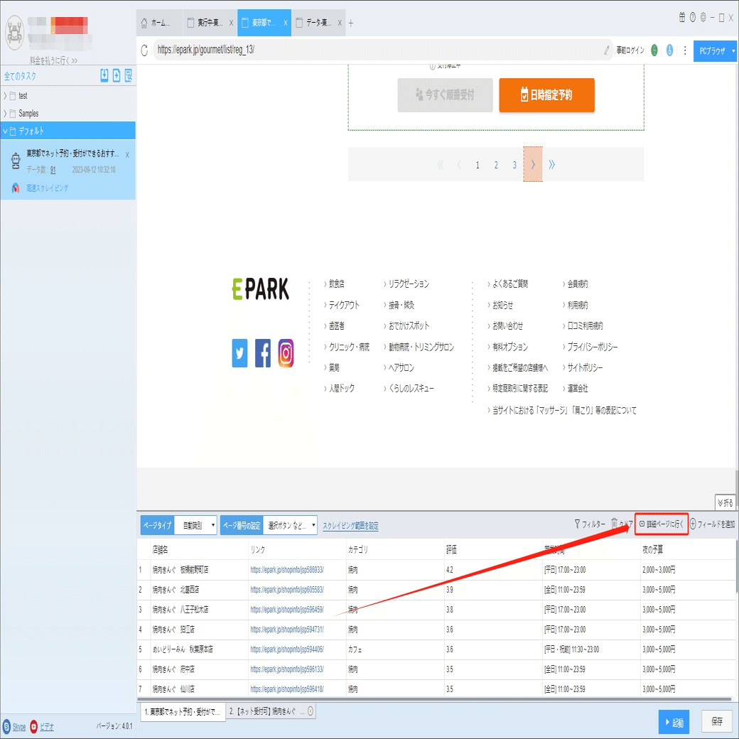 アクセス、予約番号などの詳細情報は詳細ページに付いていますから、ソフトウェアの「詳細ページに行く」機能を利用して、データを抽出します。