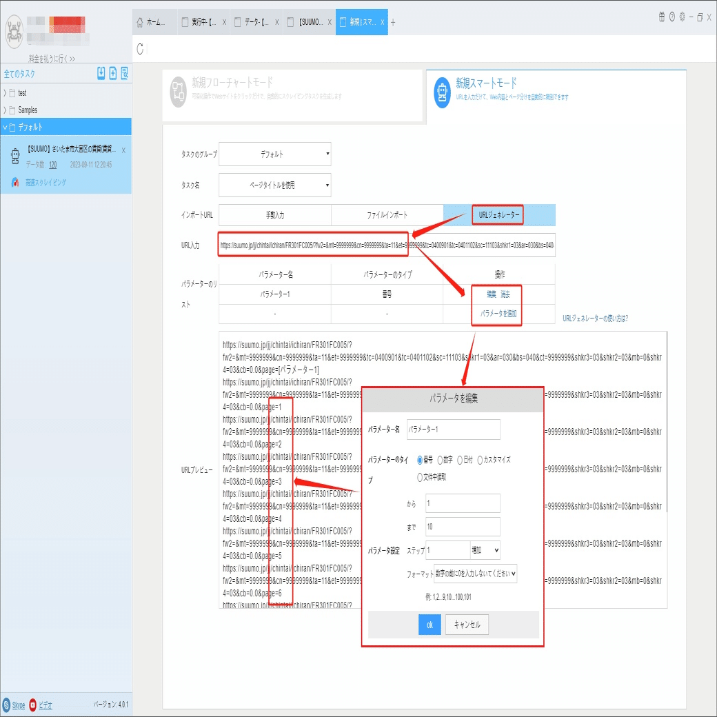 URLジェネレータでURLを入力して、パラメーターを追加画面にページ数を入力します。今回は10までです。生成したURLはプレビュー画面でチェックしてください。