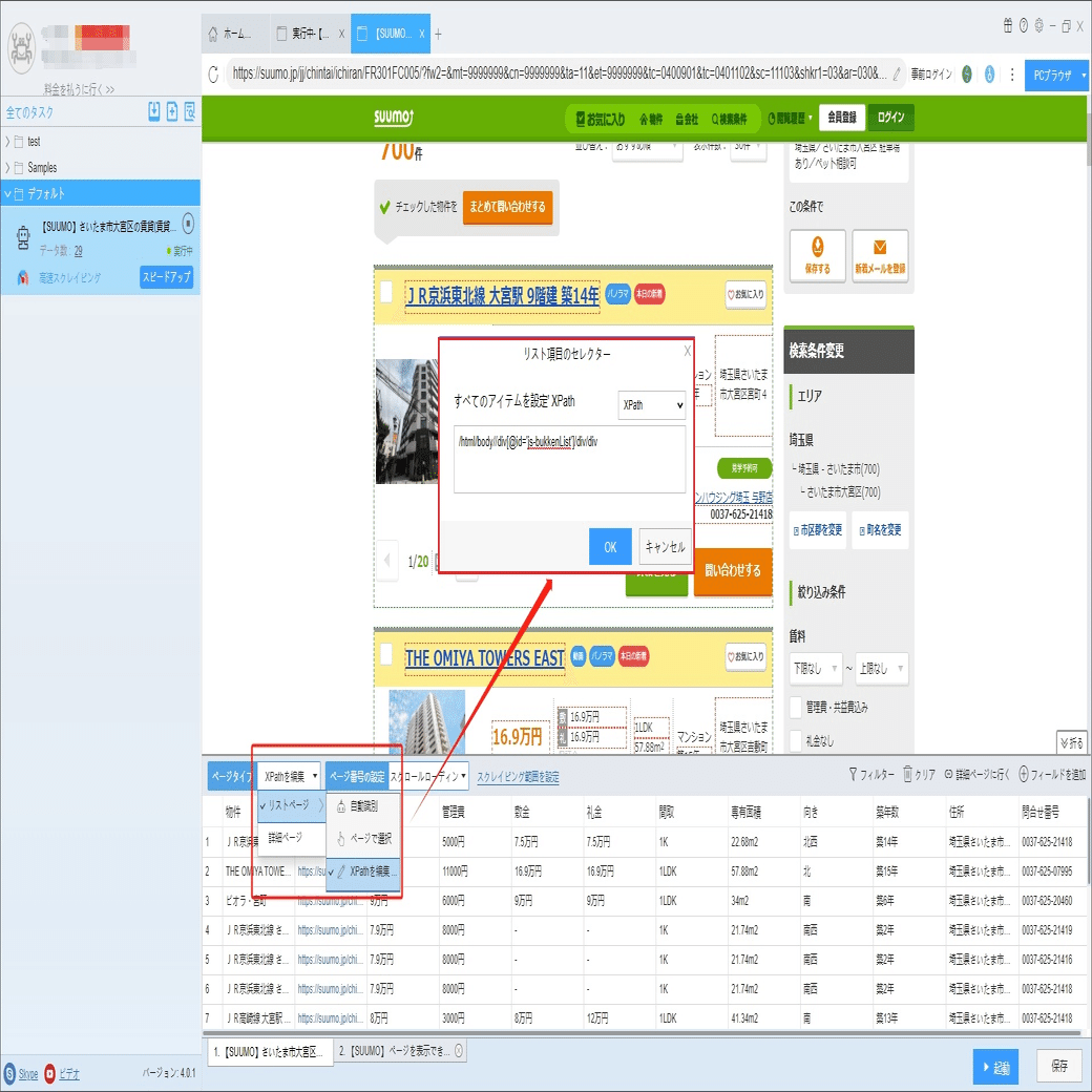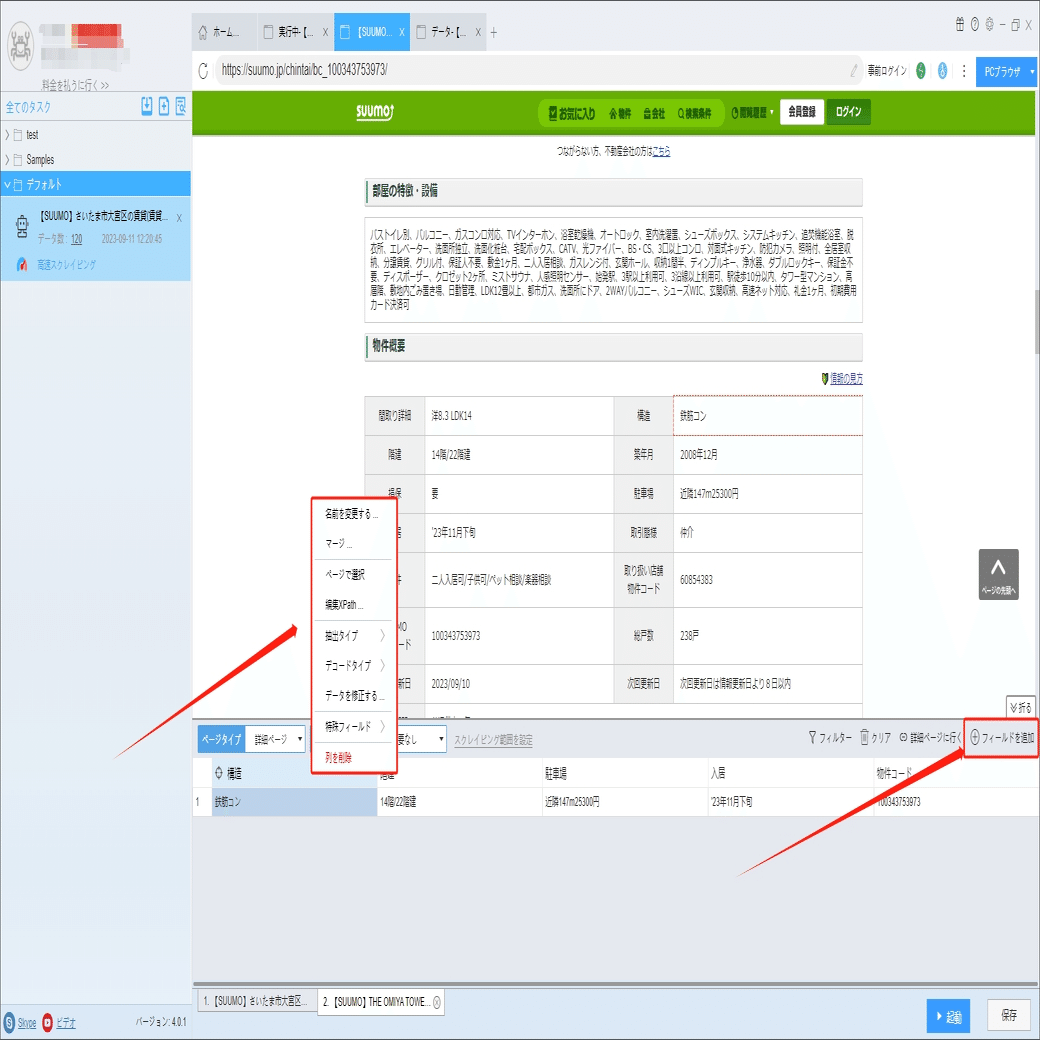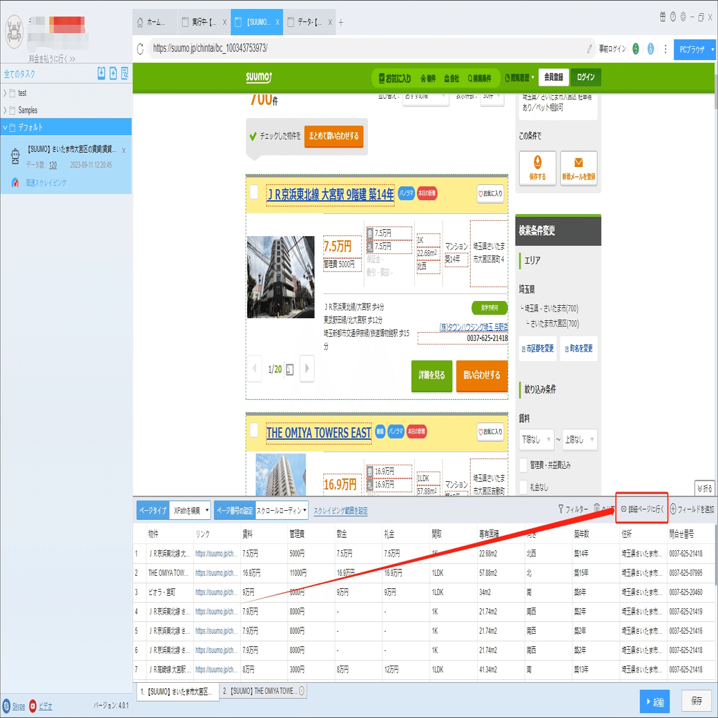 構造、入居、駐車場などの情報は詳細ページに付いていますから、ソフトウェアの「詳細ページに行く」機能を利用して、データを抽出します。