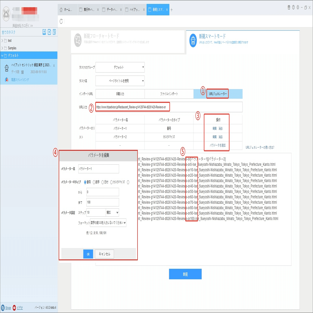 URLジェネレータでURLを入力して、パラメーターを追加画面にページ数を入力します。今回は0から100まで、ステップは10に設定してください。生成したURLはプレビュー画面でチェックしてください。