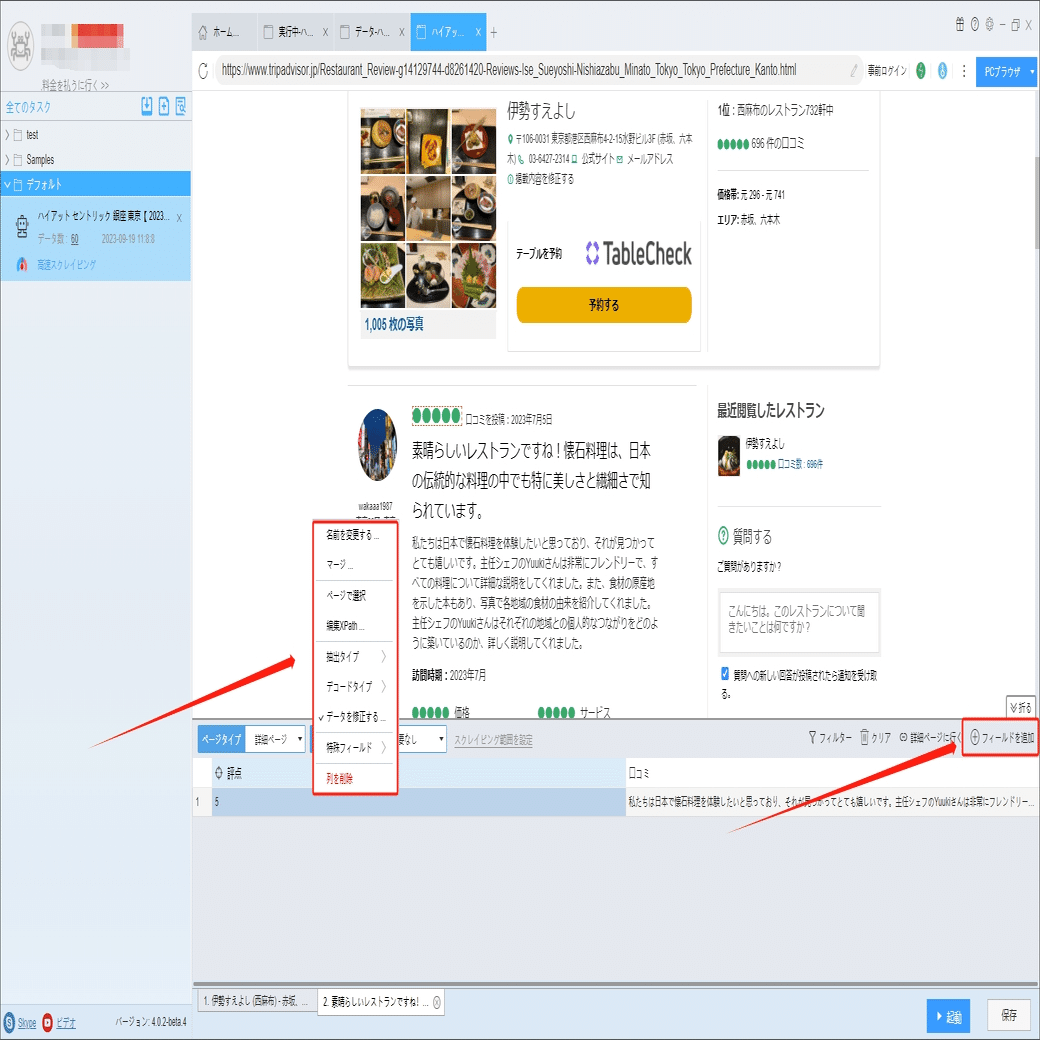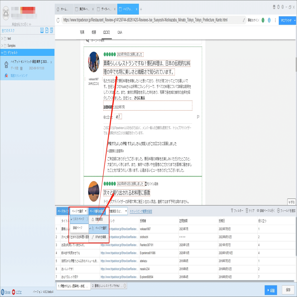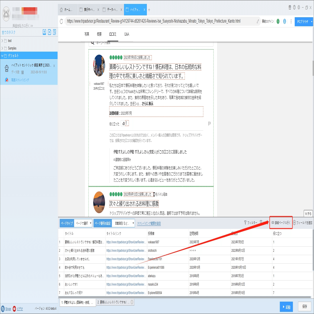 口コミ全文はは詳細ページに付いていますから、ソフトウェアの「詳細ページに行く」機能を利用して、データを抽出します。